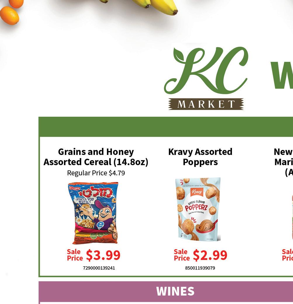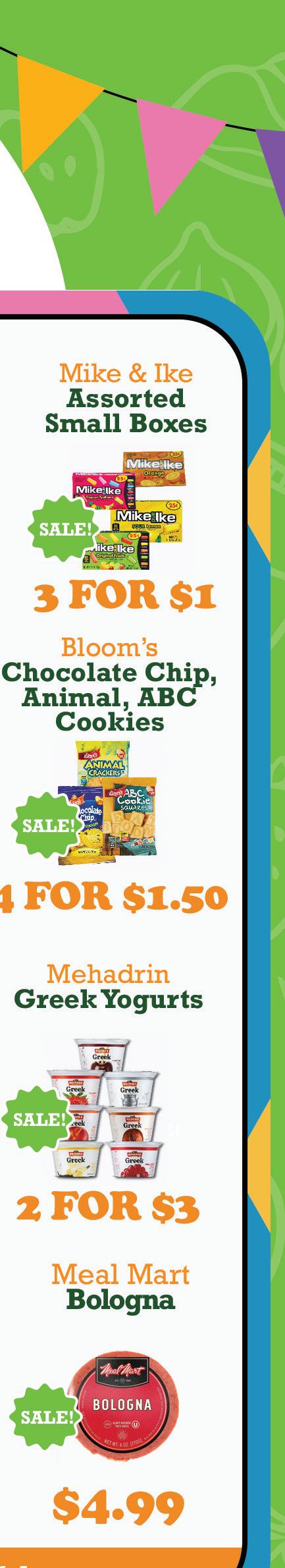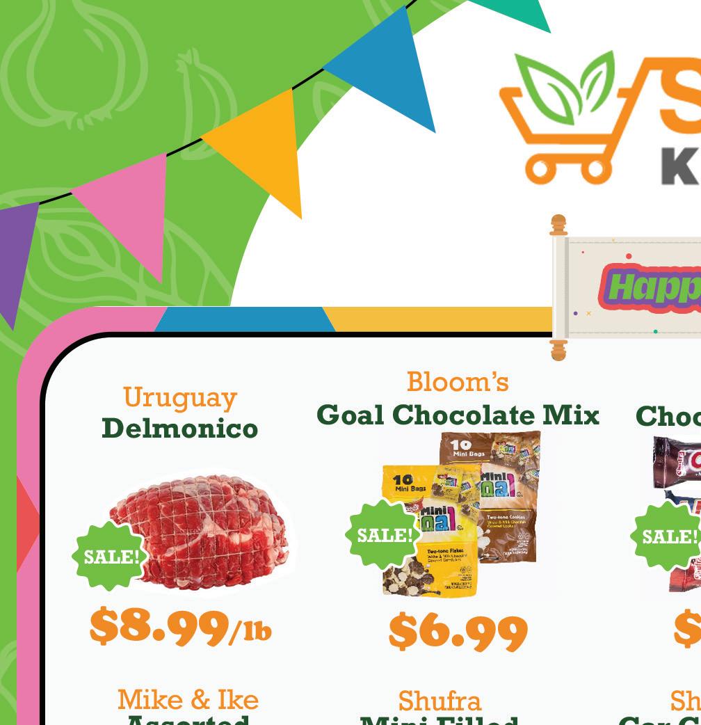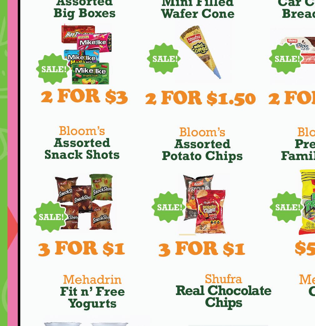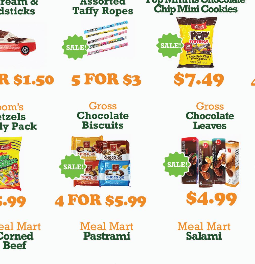 SNACKS $4.79 3 FOR $9.99 LOTUS BISCOFF COOKIES 11OZ $5.99 3 FOR $11.99 OREO ORIGINAL (PAS YISROEL) $3.99 3 FOR $8.99 DREAM PRETZELS 1.94-2.1OZ $1.49 $1.29, MIX-N-MATCH 10 FOR $11.99 PURE BITES FRUIT-A-PEEL $2.99 $2.49, 5 FOR $11.49 BLOOM'S SNACK SHOTS FAMILY PACKS $4.99 $4.49, 3 FOR $10.99 Plus Hundreds More Items On Sale Every Day! KEDEM MINI GRAPE JUICE 8OZ $1.79 12 FOR $17.99 MINI WINE BOTTLES 187ML $4.49 $3.79 OR 4 FOR $12.99 MINI BARKAN CABERNET OR CHARDONNAY 375ML $6.99 $6.29 OR 4 FOR $22.99 MINI TERRA VEGA WINES 375ML $5.99 $5.29 OR 4 FOR $19.99 ALL 750ML BOTTLES BUY ANY 6 BOTTLES, GET 10% OFF JORAY FRUIT ROLLS $0.89 $.79, 10 FOR $6.99 Wines and Grape Juice