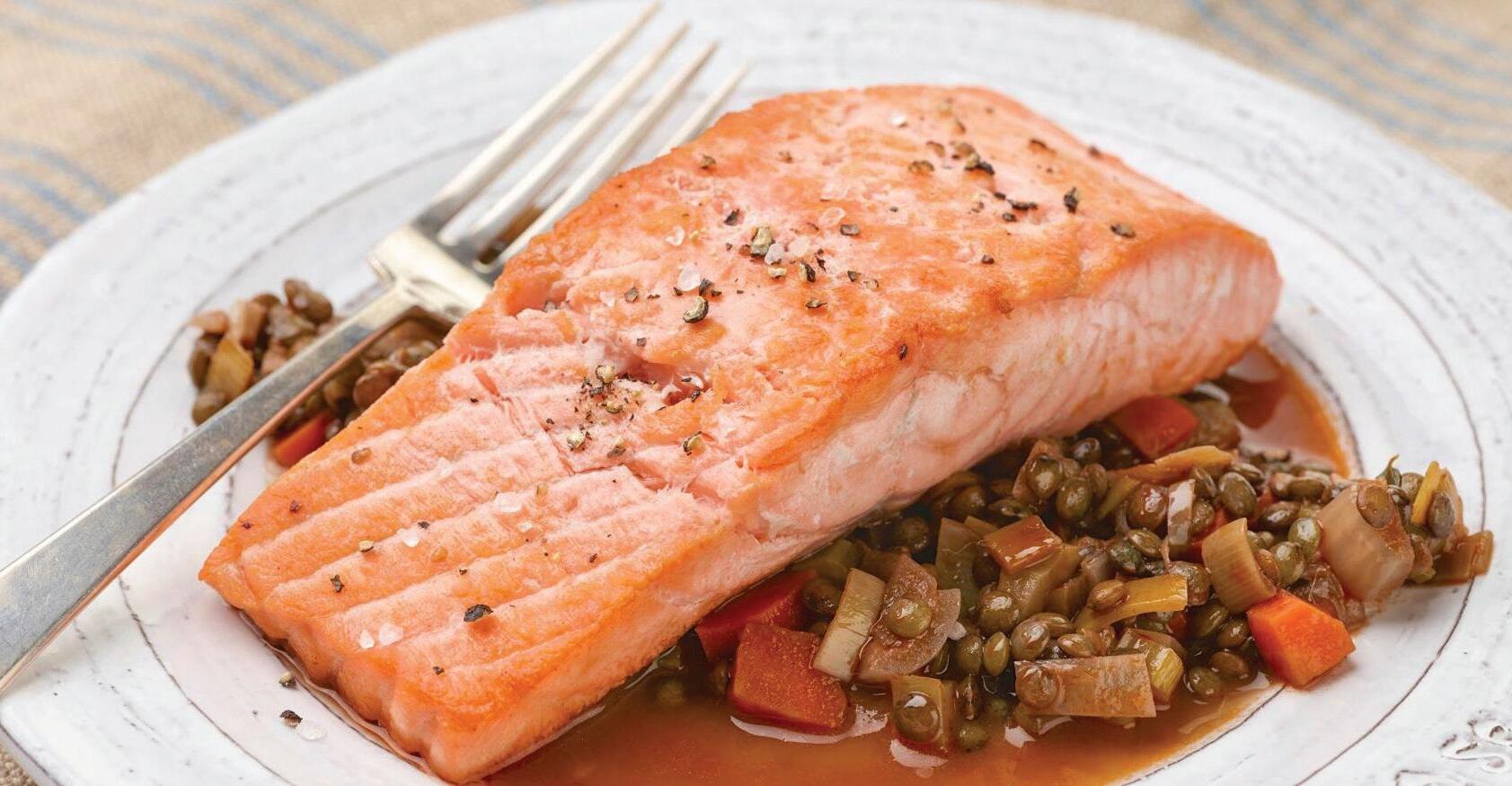1. Remove the skin from the salmon fillet. To do this, grip the skin at the end nearest to you, then cut between the flesh and the skin, keeping the skin taut. Run your fingers along the fish. Feeling for bones. If you find any, pull them out using tweezers. Cut the flesh into 1-inch cubes. You will need 10 pieces per serving.