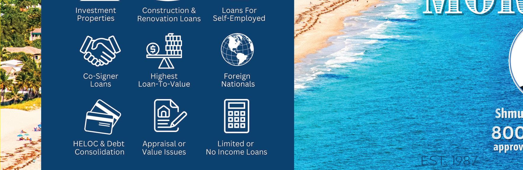 MARCH 7, 2024 / P.53 THINKING OF SELLING YOUR BUSINESS? Mitchell Weinberger with Sunbelt Business Brokers can help you sell your business. • Free Business Brokers Valuation •Friendly, Warm, Smart Service • Always Confidential! ./ HVAC COMPANY ./ROOFING COMPANY ./DISTRIBUTION ./CPA ./ALF ./DAYCARE EXPLORE THE BENEFITS OF SELLING YOUR BUSINESS! Contact us for a free, no-obligation business valuation today. © (786) 468-9248 Mitchell Weinberger mltchw@sunbeltnetwork.com With special musical guest, Sam “Bodi” Bodenheimer STANDUP $100 Single ticket. $180 Couple. AviComedian Liberman MOTZEI SHABBOS, MARCH 9 DOORS OPEN AT 8:30 PM FOR BIKUR CHOLIM Join us for an evening filled with laughter, delicious food, drinks, and awareness for the Kosher Room at Memorial Regional Hospital. B”H LAKES OF EMERALD HILLS HOLLYWOOD, FL Address provided after registration. HHFLORIDA.COM/STANDUP DUNWELL ARTISAN PIZZA. COCKTAIL RABBI. SUSHI. Attention REALTORS! Be featured in our brand-new Real Estate Section and Reach 60,000 readers in 25 cities throughout Florida! Contact Eliyahu Segal today info@tsfcommunityvoice.com (954) 662-5054