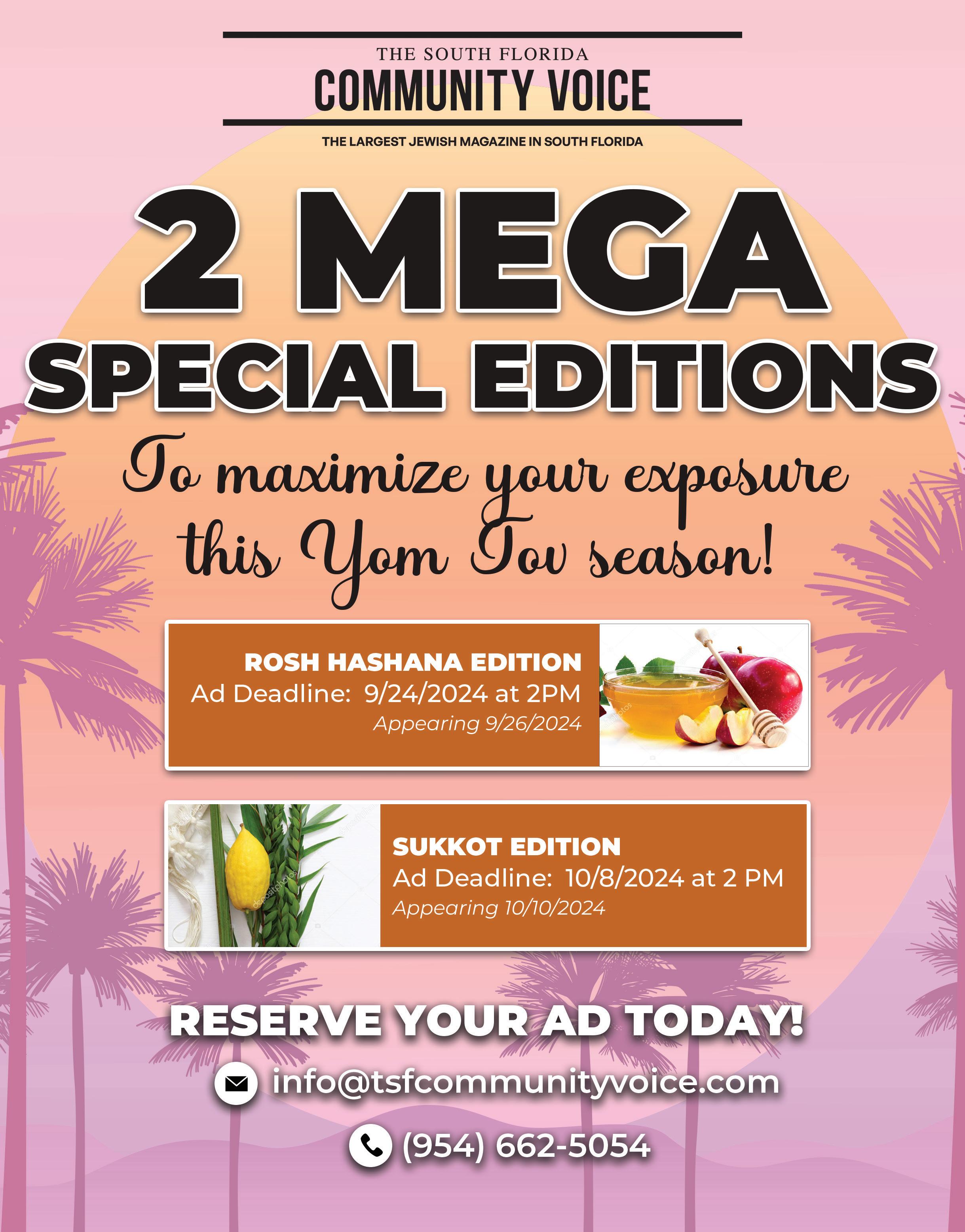 It is a great privilege to present the South Florida Community Voice. This weekly publication features updates, articles, and advertisements from local businesses. We are proudly affiliated with the finest and most reputable business owners and service providers of South Florida’s thriving Jewish communities.