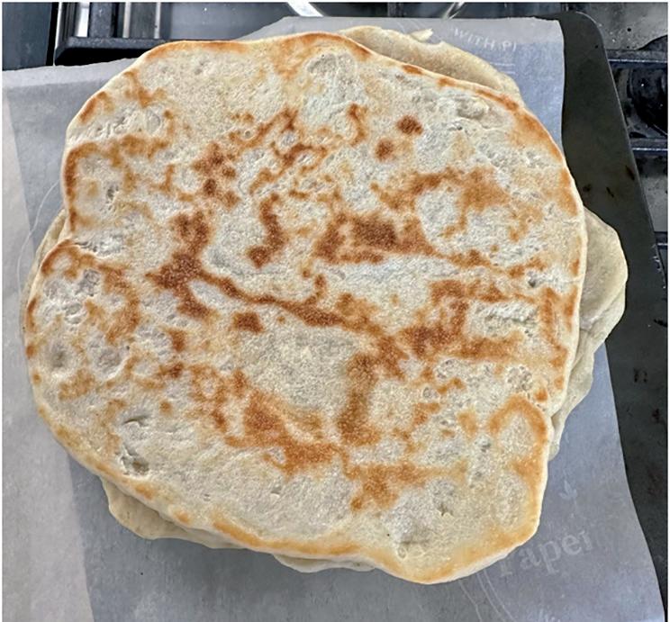 Heat a dry frying pan over medium-high heat. Roll out one of the dough pieces very thin or carefully stretch with your hands. I prefer stretching by hand. Cook in the frying pan for about 2 minutes on each side. Repeat with the remaining dough.