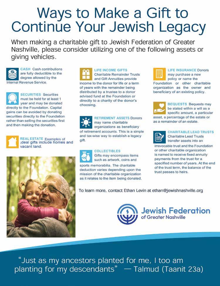 To learn more about the Jewish Foundation and its many options for philanthropic giving, contact Rabbi Dan Horwitz, CEO of the Jewish Federation of Greater Nashville at dan@ jewishnashville.org. •