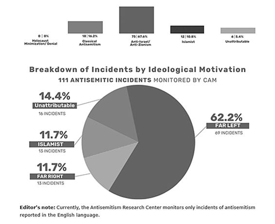 For those who like to monitor things in (almost) real time, there is the ADL’s heatmap, SCN’s daily email reports highlighting events featured in mainstream and Jewish media, and one of particular interest is the Combat Antisemitism Movement’s (CAM) Weekly Roundup, which includes a visual representation of incidents and crimes reported in English, meaning they do not fully represent the scope of antisemitism in any given week. It has always been extremely impor-