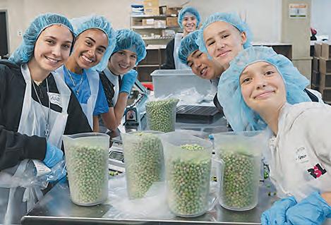 Tzedek Teens joined other volunteer groups at the Foodbank For The Heartland on Thursday, July 31. After learning about the importance and reach of the foodbank, teens suited up in aprons, gloves and hairnets to pack individual family-sized bags of frozen peas that will be available to families in need. During the twohour shift it is estimated the volunteers packed 2,400 pounds of frozen peas.