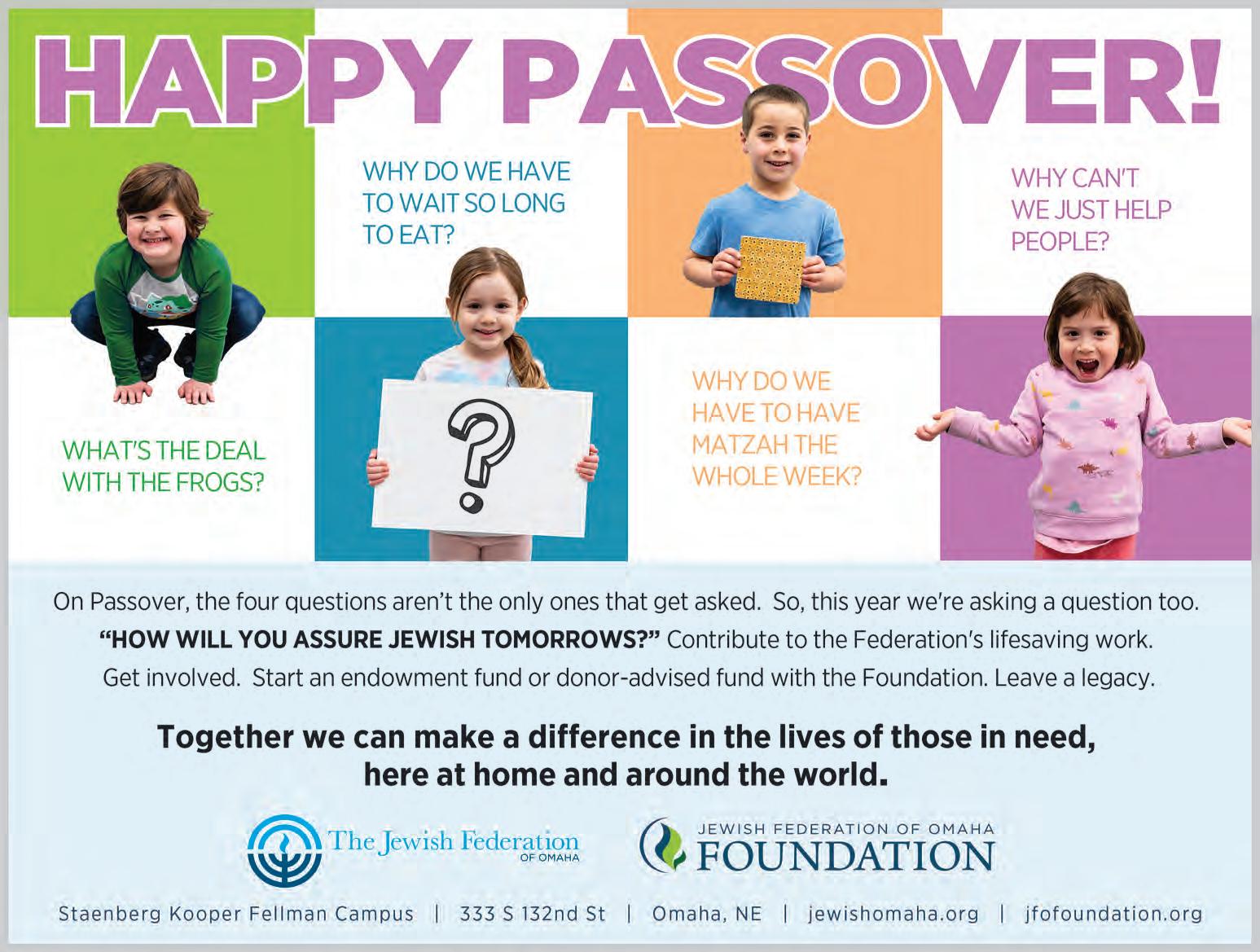 One more thing: on random pages in this paper, you will see a matzah ball. Count them, email your number to avandekamp@jewishomaha.org and you get a prize, which you can pick up at the Jewish Press office! Answers need to be emailed by the last day of Passover, which is sundown on April 9. The catch: you can only participate if you are no older than 12. Start counting!