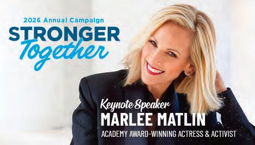 (Pomegranate); Corey and Carrie Epstein (Ben Gurion Society); Ally Freeman (Pearl Society); Candice and Dusty Friedman (Ambassador’s Circle); Bonnie Levinger, Jennifer Glazer and Eadie Tsabari (Campaign Kickoff); Erica Lucoff (Super Sunday); Jaime Mason (Hanukkah Extravaganza). Keynote speaker Marlee Matlin Matlin is known for her acting, and for her activism on behalf of deaf individuals in Hollywood and other industries. She has received both an Academy Award (the youngest to ever win ‘best actress’) and a Golden Globe, and has also been nominated for a British Academy Film Award and four Primetime Emmy Awards. And if you find yourself in Hollywood, you can find her star on the Walk of Fame, which she received in 2009.