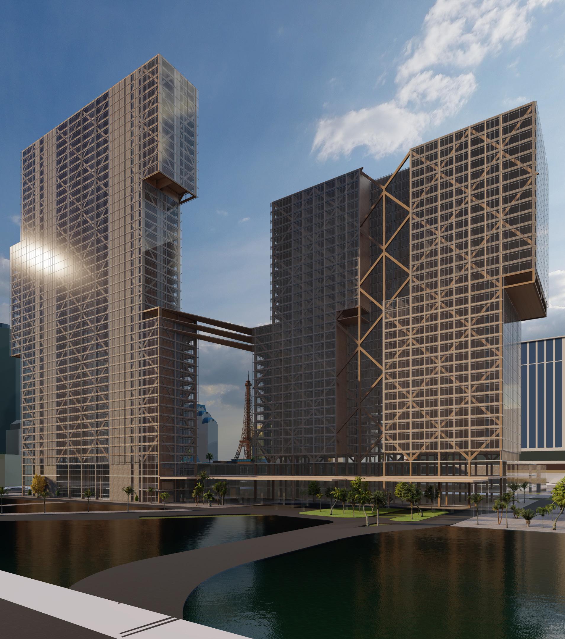 El proyecto cuenta con dos torres, una de 42 pisos y otra de 30. La estructura del proyecto es una combinación de GLT y CLT, materiales sustentables. El hotel cuenta con alrededor de 1200 habitaciones, tanto dentro como fuera del proyecto. El objetivo es estar en contacto con el entorno y proporcionar un lugar para respirar, dentro y fuera del hotel-casino, algo que escasea en otros proyectos de esta zona.
