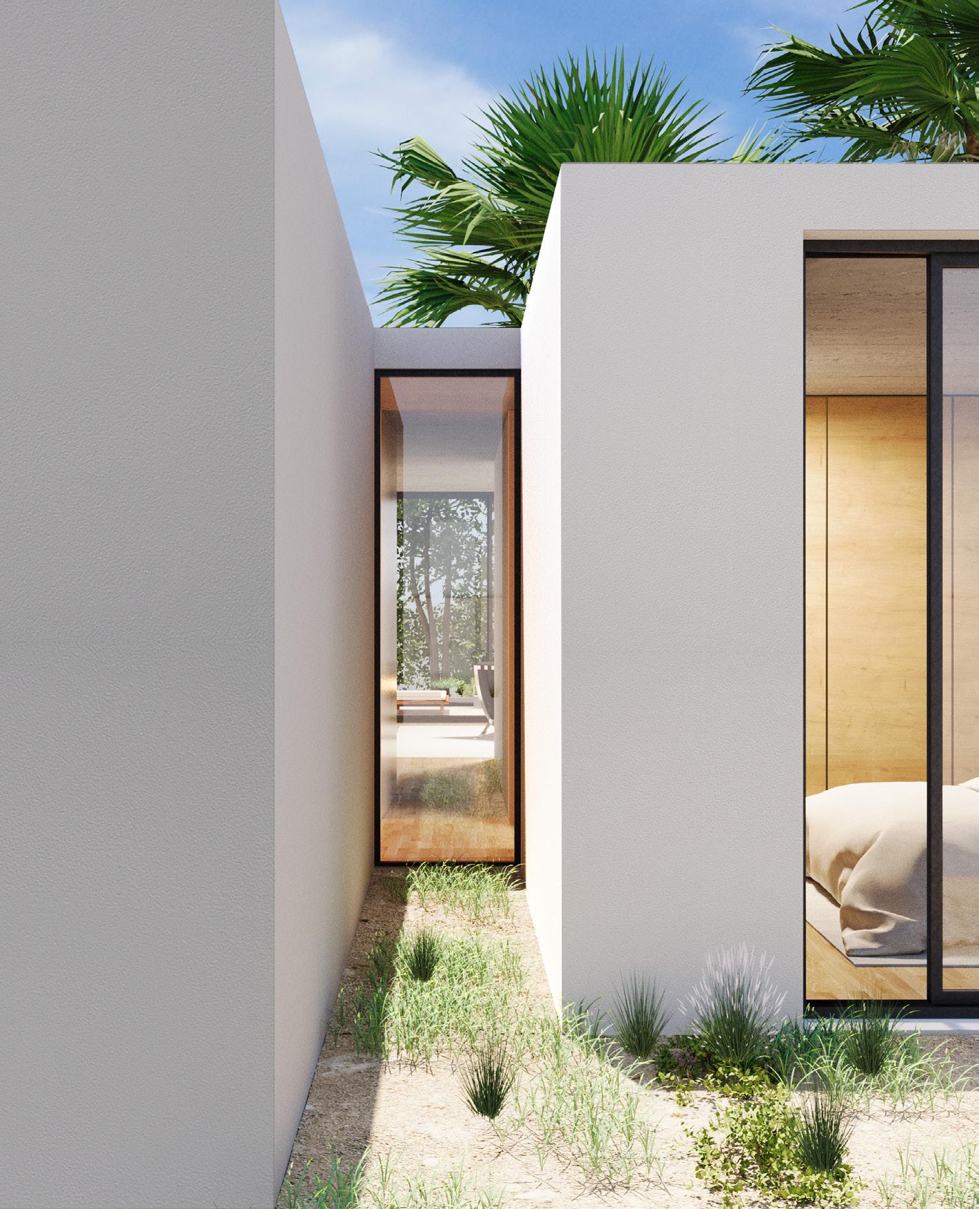 Ubicada en la parte sur de Portugal, esta sencilla villa se compone de tres dormitorios, un espacio abierto y un garaje. Lo que define a este proyecto es su capacidad de acercar el exterior al interior sin salir de casa. Este efecto lo consigue con estos amplios ventanales de suelo a techo. Lo cual, cuando se abre, hace que parezca que, para empezar, la partición nunca estuvo allí.