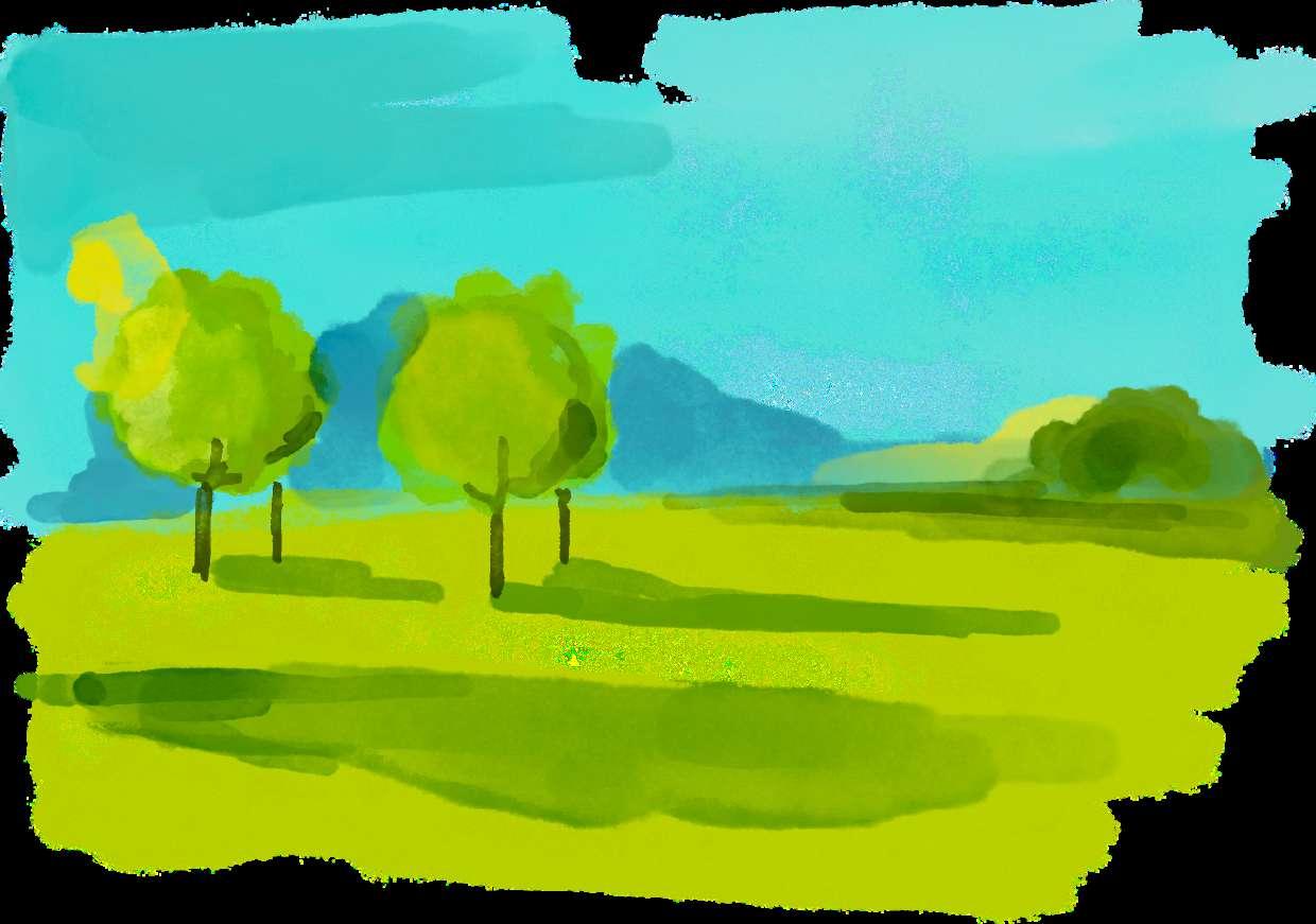 Cheia de sol e flores de todas as cores, vermelhas, azuis, amarelas. Árvores altas e verdes cobertas de folhas, onde reluzem as cores do arco íris.