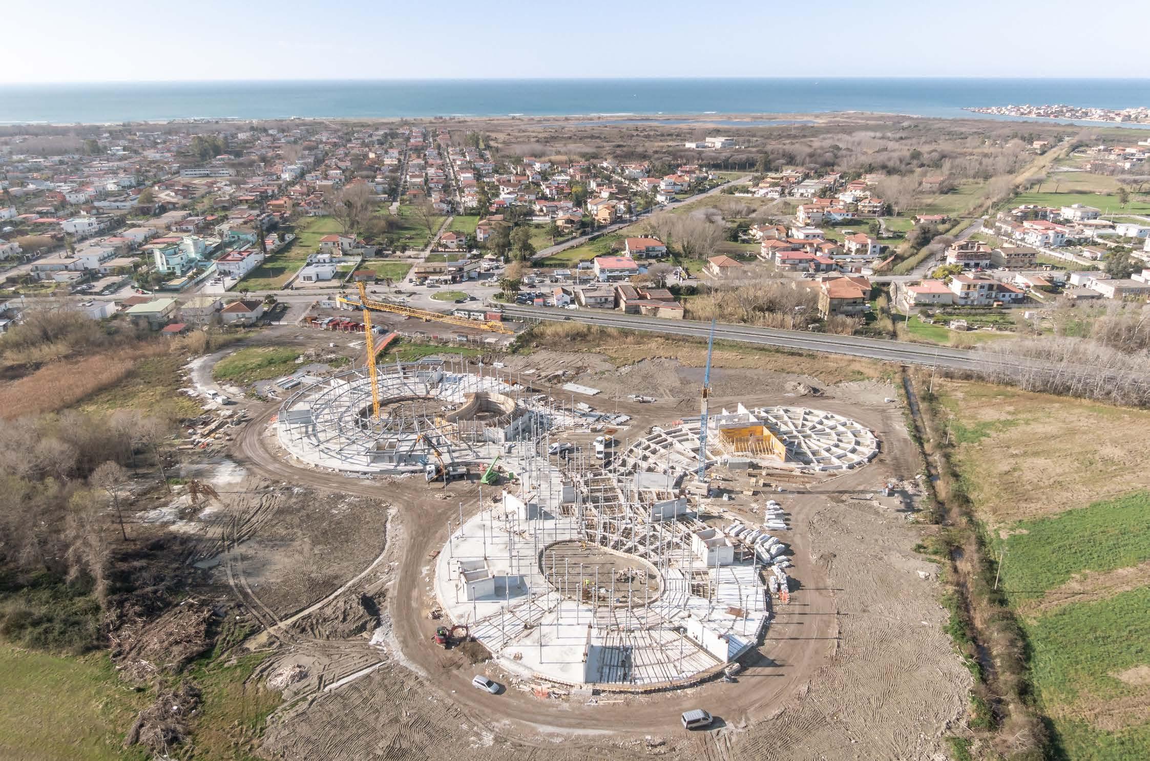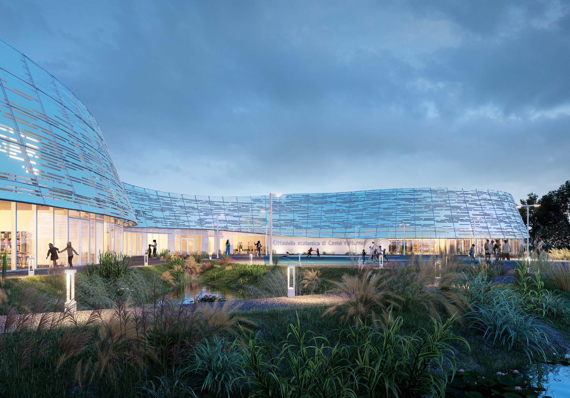 The project consists of the creation of the largest school complex in Italy, with nearly 15,000 m², on land reclaimed from the mafia, and covering approximately 69,894 m². It will have capacity for 1,800 students from Kindergarten to Secondary levels. The design, inspired by a drop of water on earth, integrates the Garibaldi Institute, the Castel Volturno Centro Institute and a gym. The design features continuous and fluid spatial elements, reminiscent of the incessant flow of the Volturno River.
