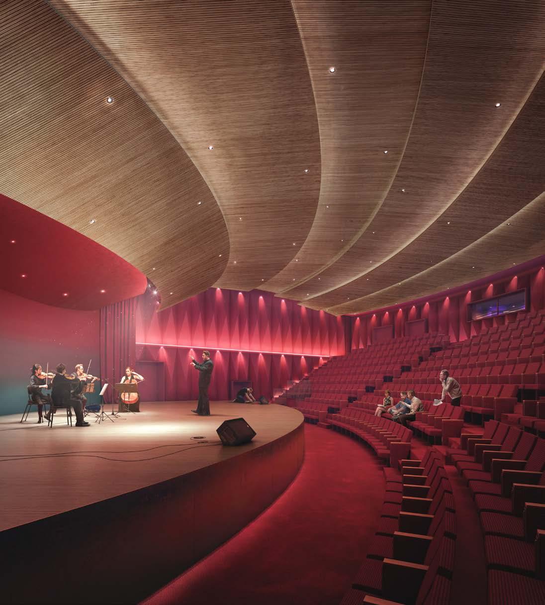 The project consists in the creation of the new Milan Music Conservatory, inspired by the surrounding forest and its organic forms, particularly the diverse shapes of leaves and natural sounds. The design reflects nature’s influence on the arts, echoing music’s origins as an emulation of natural sounds used in ceremonies. It aims to sustainably revitalize an inaccessible area, transforming it into an open, inclusive space that catalyzes regeneration. This includes refurbishing the “Ex Chimici” building and constructing three new structures, two for educational activities and one for student housing, enhancing both functionality and environmental renewal.