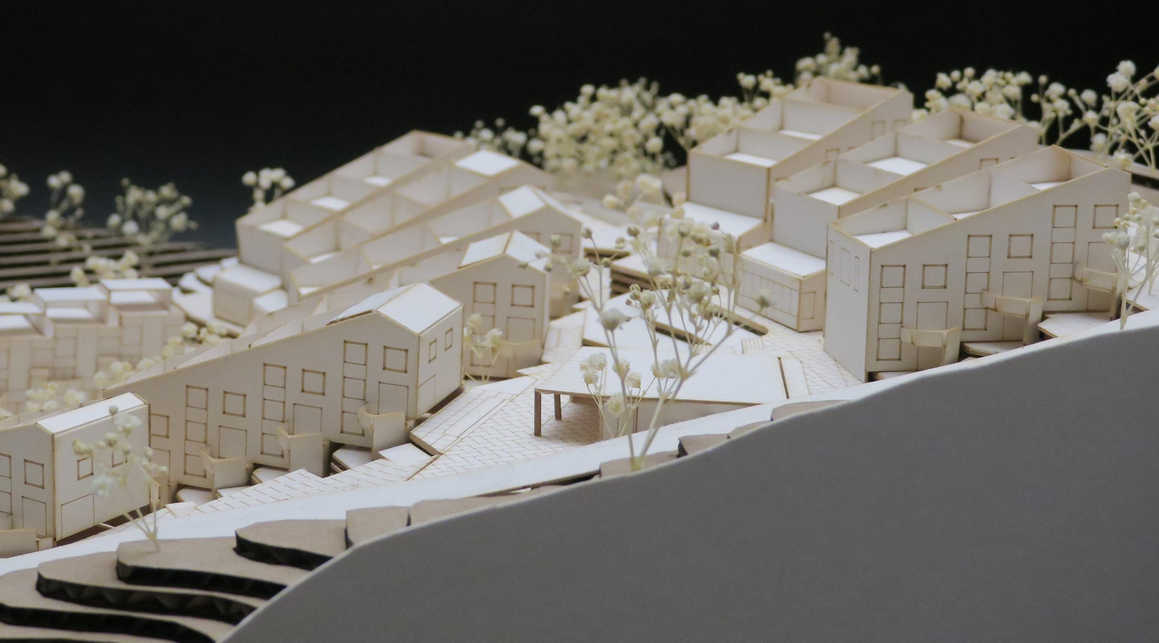 There are three different types of blocks depending on the slope of the terrain. Within each block, I experimented with the idea of bi-familiar housing: this allows for each household to remain with certain individuality and is closer to the original single-family typology, while also densifying the area without losing its character.