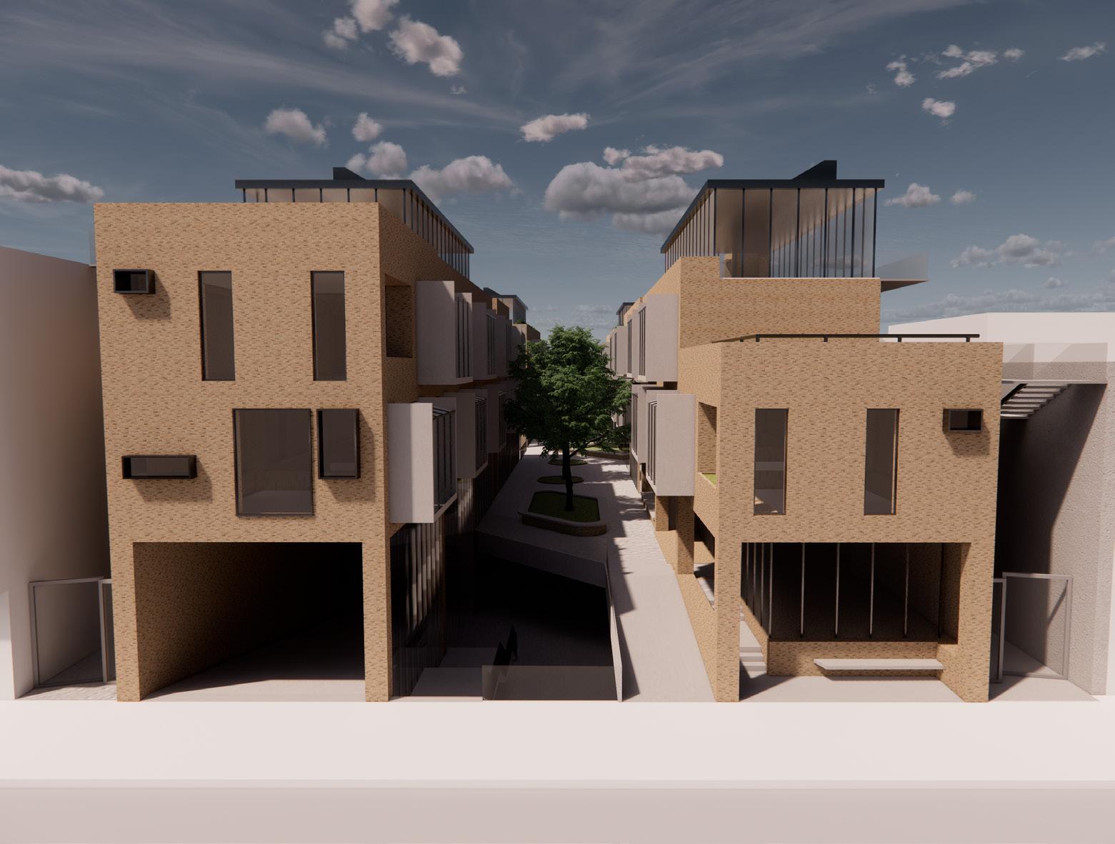 Access is through the lower and middle level, depending on the slope and grouping of the units, via a concrete piece that both acts as a retaining wall, and marks the entrance. Top units enjoy a rooftop terrace, and lower units enjoy a more generous front and back entrance porch.