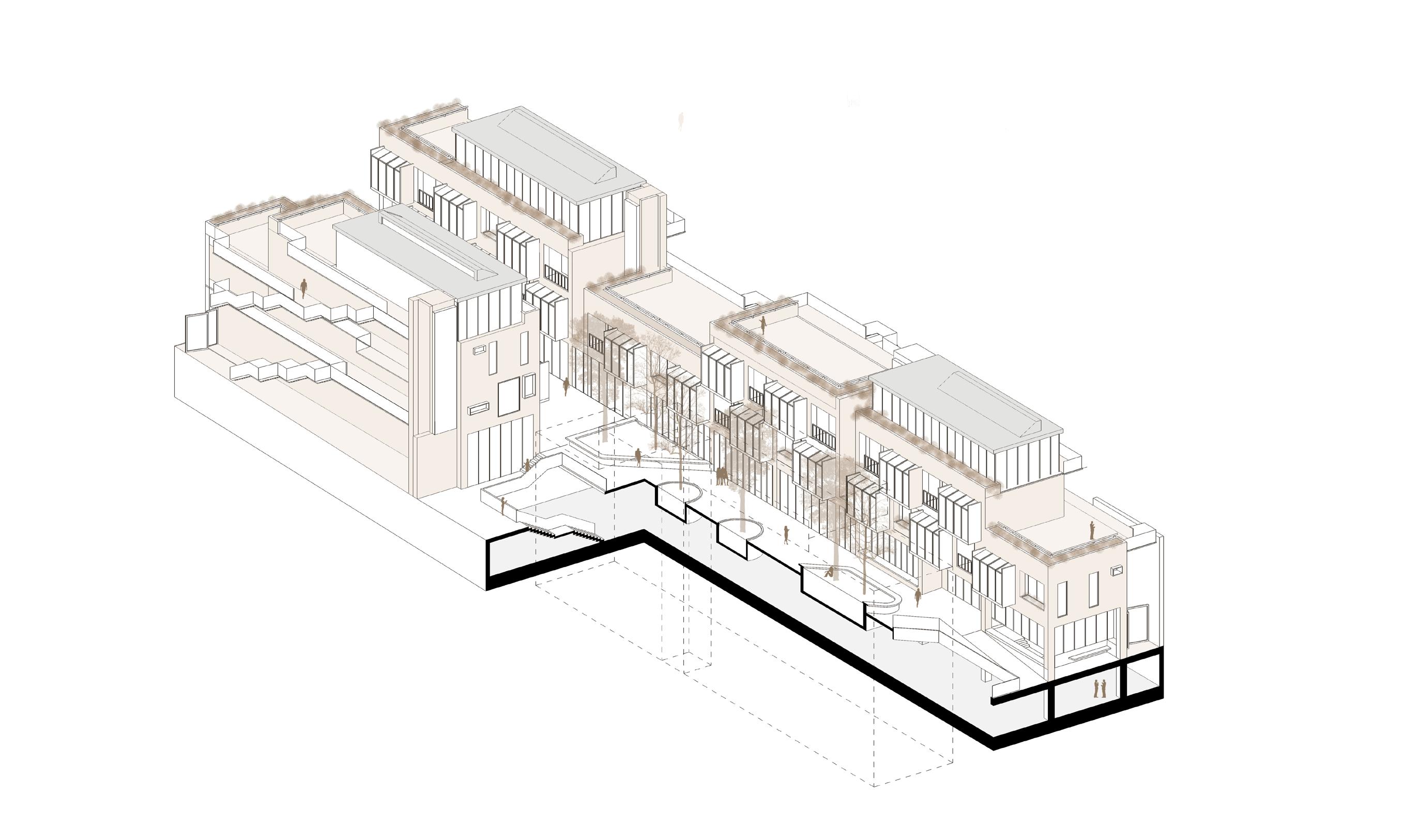 Each housing block is designed in such a way that the access to the homes is located on one of its facades, while the access to the productive spaces is located on the other. In this way, the mixed uses of the first floor generate flows of activity in the public circulation routes. In addition, each block has a larger communal or commercial at its lower end. private spaces (housing)