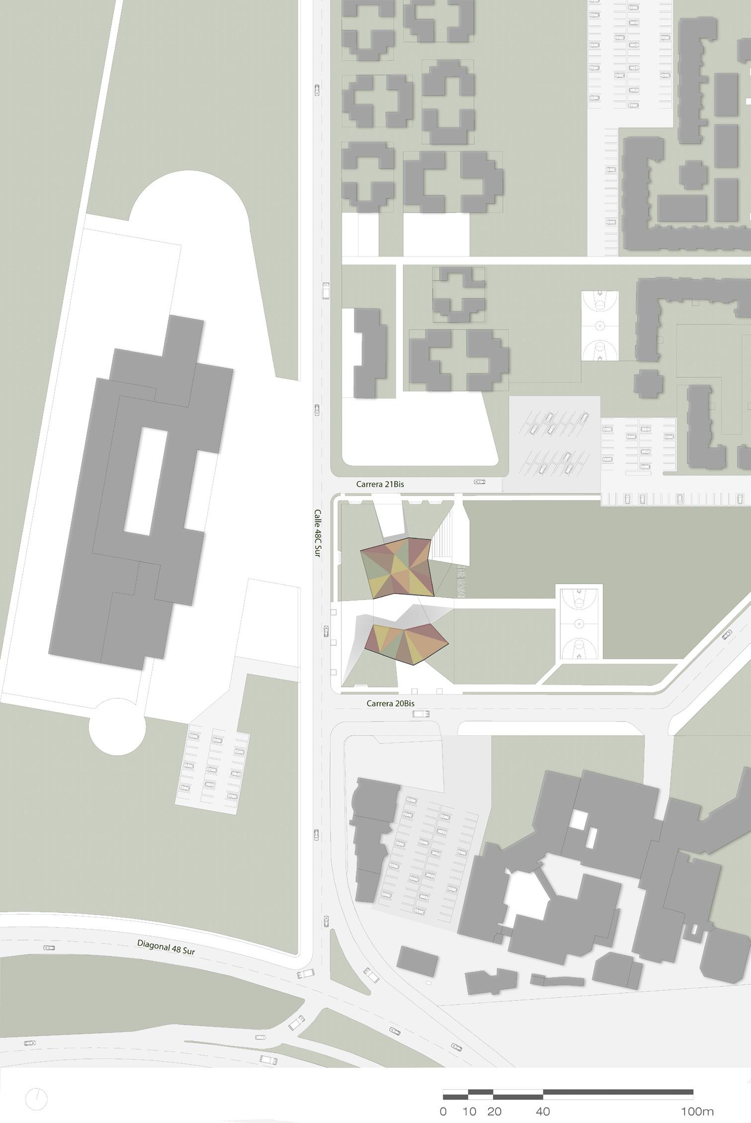 The final exercise of this course consisted of the design of a community center in the El Tunal neighborhood, in southwestern Bogotá. The proposed lot is located in a small park adjacent to a larger, metropolitan scale park, and in front of a public library.