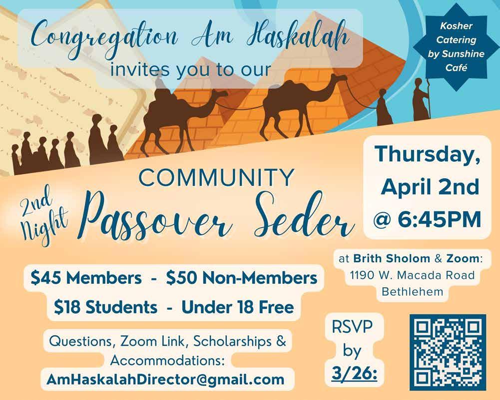 Brith Sholom for the retelling of the story of Exodus. Dinner catered by Sunshine Cafe features one seder plate per table along with charoset, matzah, herb and citrus roasted chicken, gefiltefish with red horseradish, wine and grape juice, and more. $45 per adult member (including nonmember relatives), $50 for adult nonmembers, $20 per child (6-13), free for children 5 and under, but no one will be turned away for inability to pay. Vegetarian meals available by advance request. Contact the synagogue office at 610-866-8009 and RSVP by March 27.