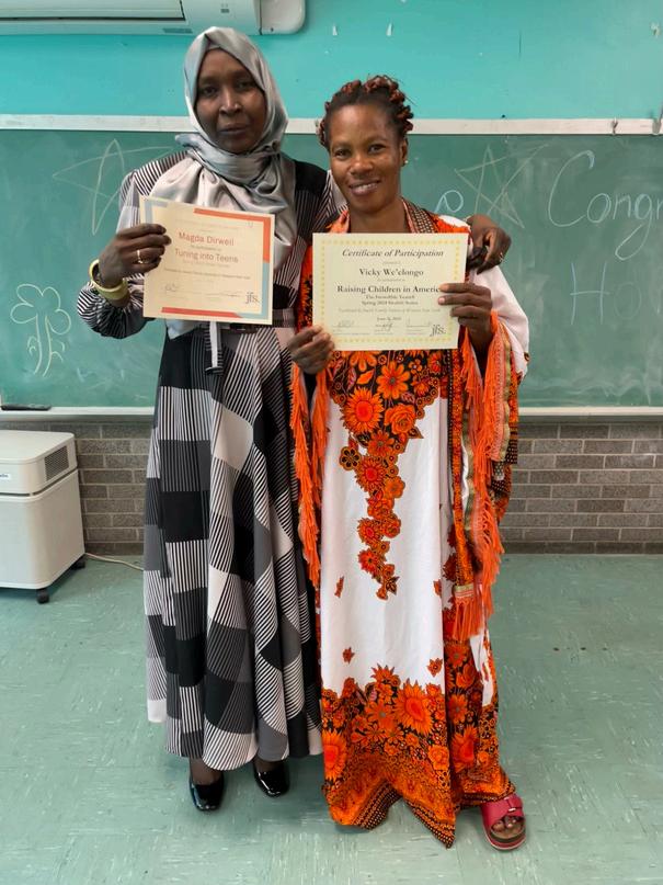 In Summer of 2023, we were invited to partner with Buffalo Toronto Public Media to host a 4-day school readiness event for parents of kindergartners. “Building Blocks for Learning,” held at Buffalo Public School #45, welcomed 25 families, with JFS Community Liaisons providing interpretation in 4 languages: Arabic, Burmese, Dari, and Swahili. Facilitation partners included Journey’s End Refugee Services, Say Yes Buffalo, and Jericho Road Community Health Center. One of the highlights of the event was getting to help get PBS materials translated into the languages of our program participants!