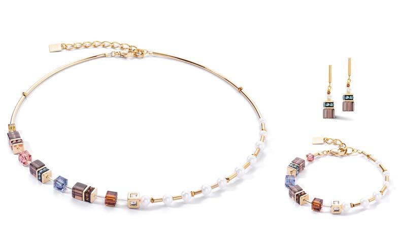 Fresh water pearl, cut glass 1522: chalcedony, amazonite, blue aventurine, pink aventurine, stainless steel 1110: tiger’s eye, stainless steel gold