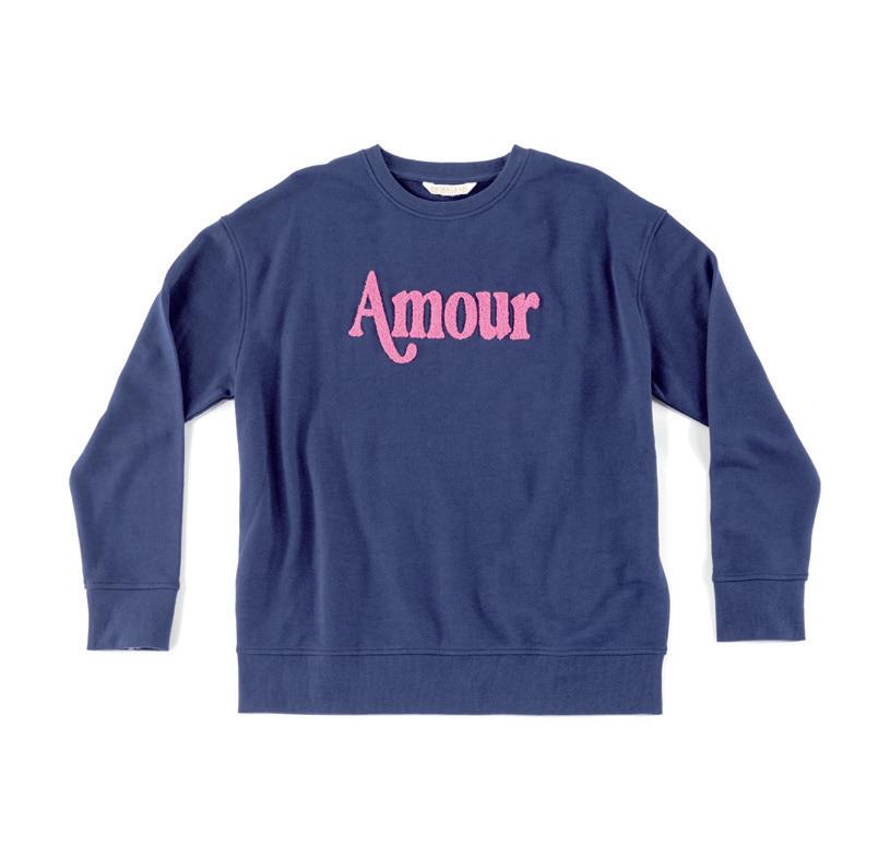 “AMOUR” SWEATSHIRT relaxed fit • cotton and polyester; machine wash, tumble dry low • China v min 2 CAD $45 ea NAVY SMALL•04-88-406NVY