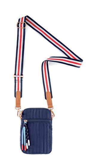 L 16” x W 6” x H 11.25”; strap 10” • polyester knit; double shoulder straps; magnetic snap closure; 1 inner zip pocket, 1 inner slip pocket • China v min 2 CAD $53 ea