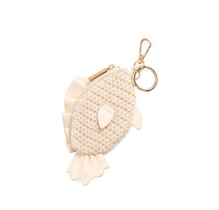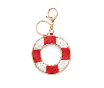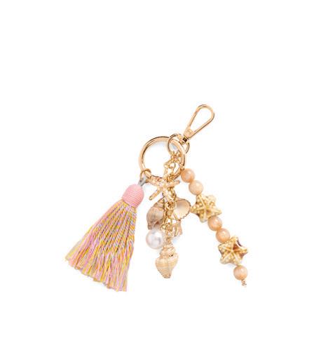 OCEAN BAG CHARM/KEY RING NEW L 3” x W 4” • polyester, shells and faux pearls; gold hardware; key ring; clasp hook • China MSRP $22 min 4 $10 ea