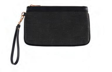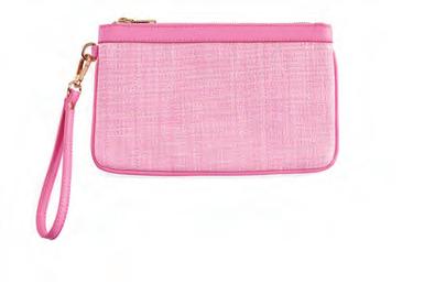 L 10” x W 6”; wristlet 7” • pp and pu; gold hardware; detachable wristlet strap; top zip closure; 1 inner slip pocket • China v MSRP $40 min 4 $18 ea