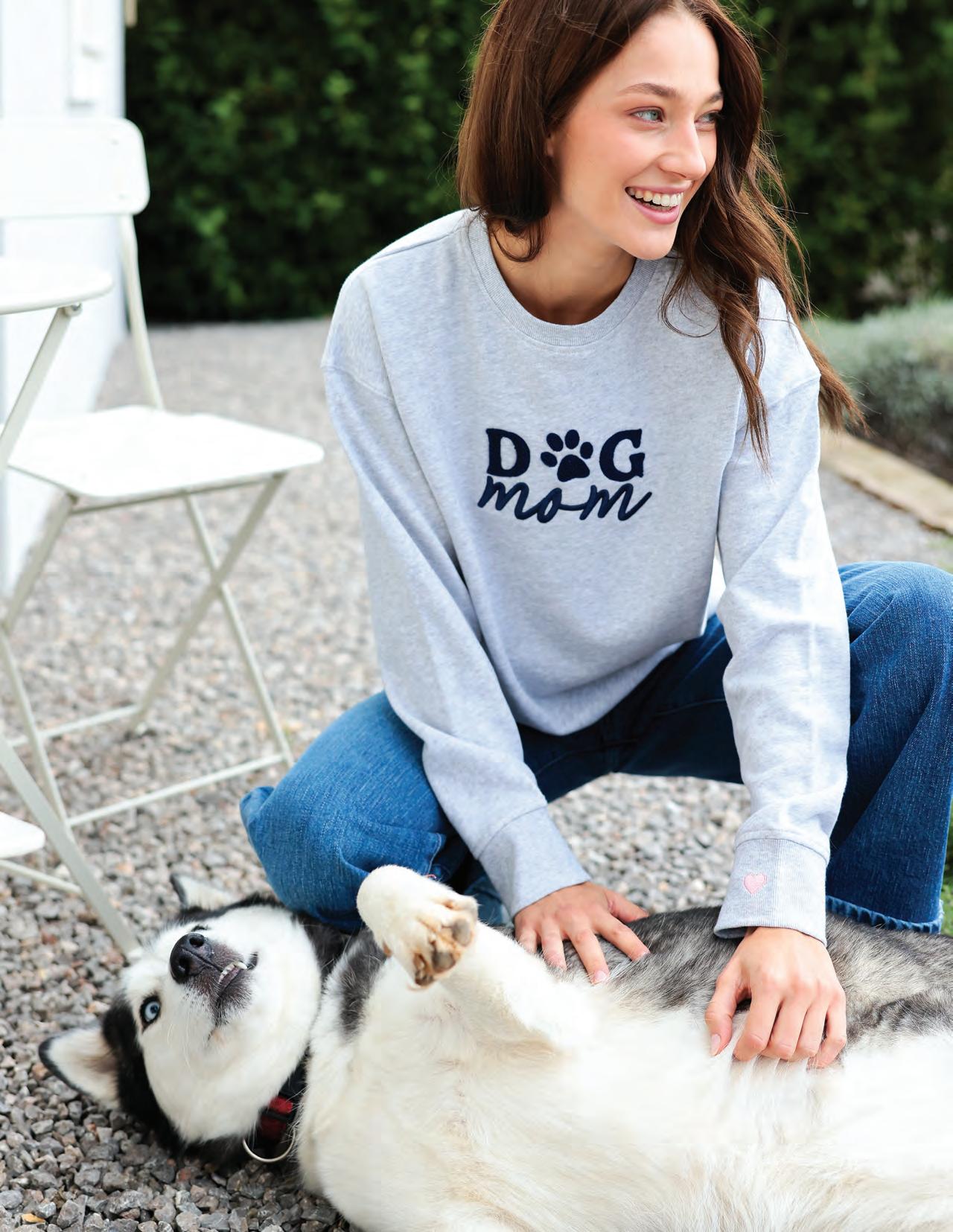 “DOG MOM” CLASSIC SWEATSHIRT cotton; machine wash, tumble dry low • China v MSRP $70 min 2 $32 ea GREY
