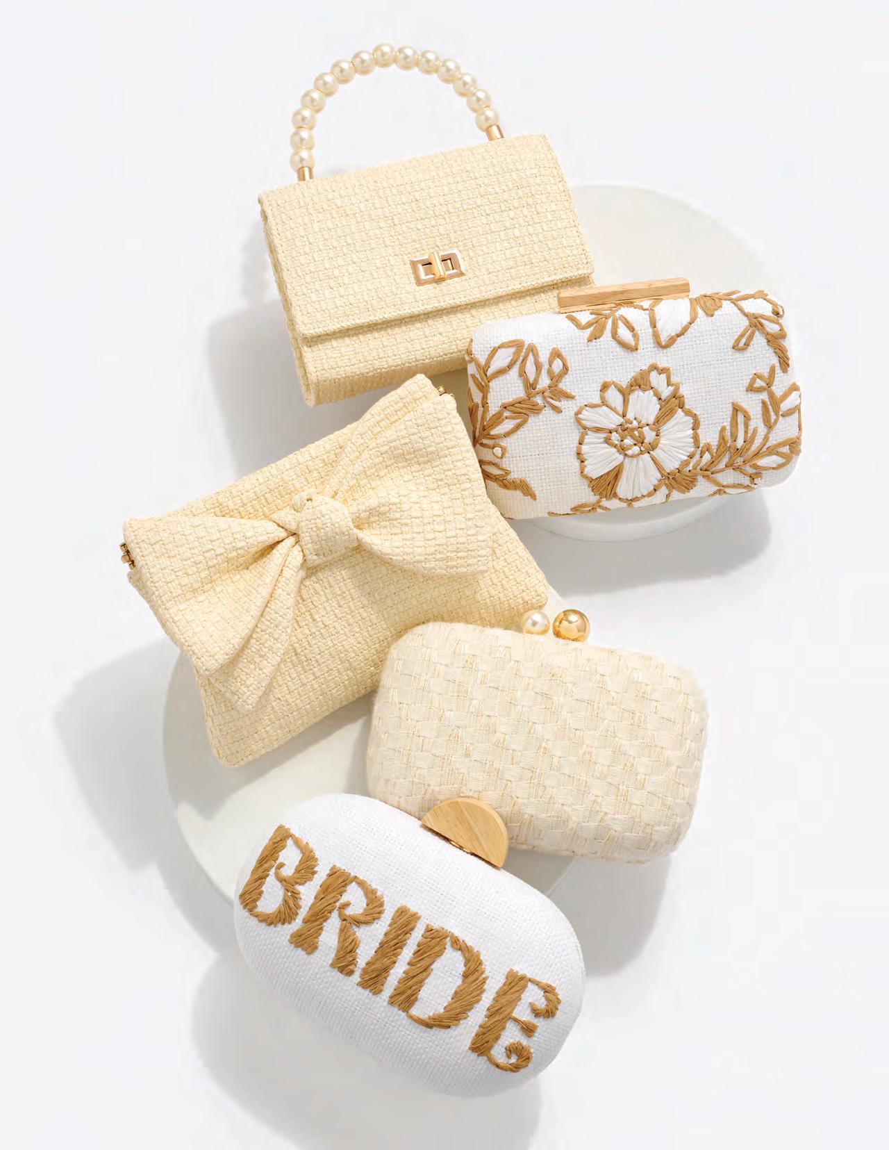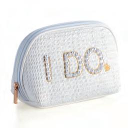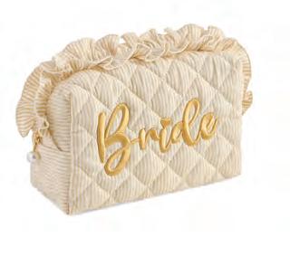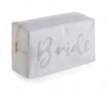 “BRIDE” LARGE ZIP POUCH L 9.5” x W 4” x H 6” • polyester; top zip closure • China v MSRP $40 min 4 $18 ea WHITE