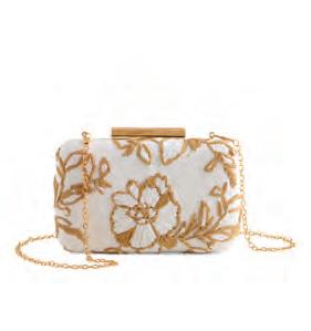 L 8” x W 1.5” x H 4”; chain 23” • polyester and faux pearls; gold hardware; detachable cross-body chain; magnetic frame closure • China v MSRP $57 min 2 $26 ea