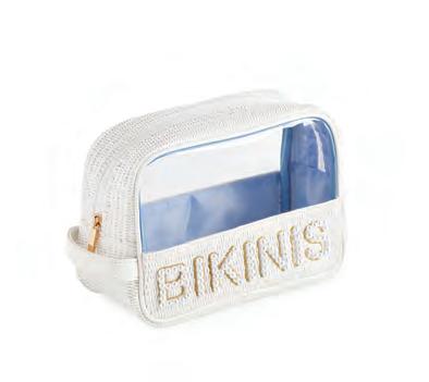 L 10” x W 2.5” x H 6.75” • paper straw, pvc and faux pearls; top zip closure • China v MSRP $28 min 6 $12 ea