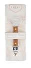 Crafted from wood & faux leather Brass buckle accents • PKG: Tag