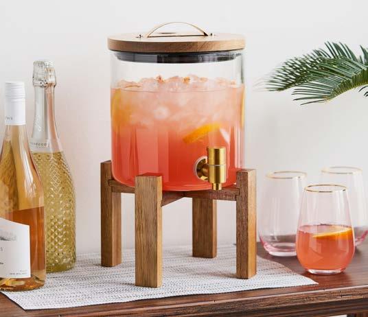 Elevate the barbecue. Perfect for batch cocktails or lemonade, this drink carafe has a bronze spigot and wooden stand.