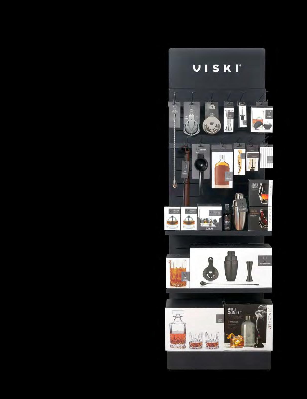 Our steel display unit is easy to customize for your needs, with two removable shelves and display bars and twelve hooks. Showcase your bestselling Viski products with ease and optimize merchandising.