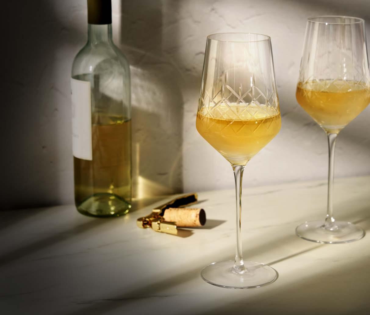 An elegant addition to our best-selling Admiral Collection, these crystal wine glasses combine a modern silhouette with a timeless hand-etched line work pattern.