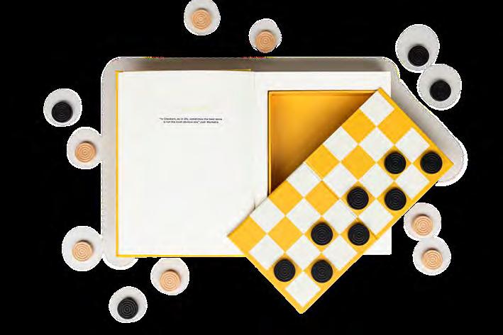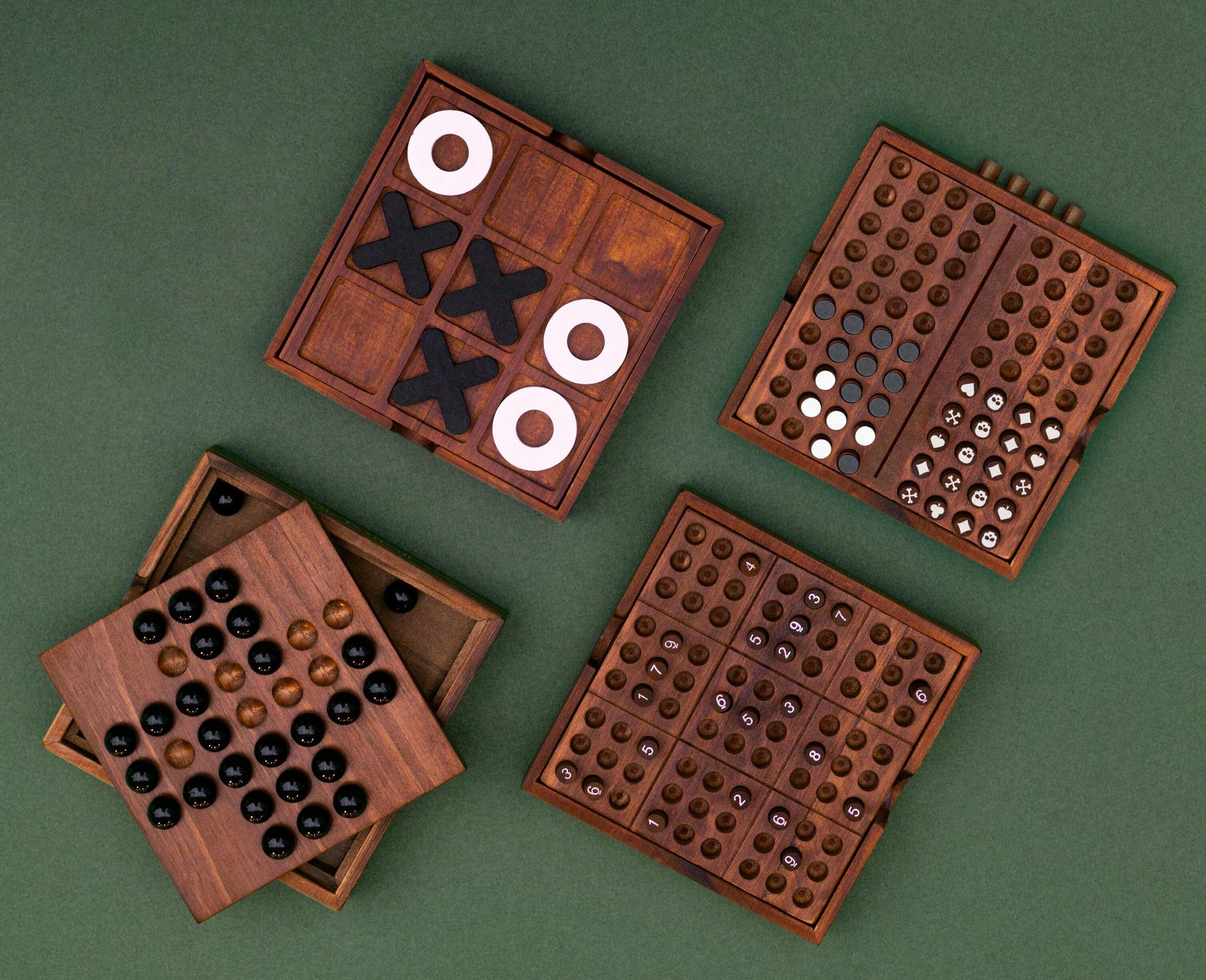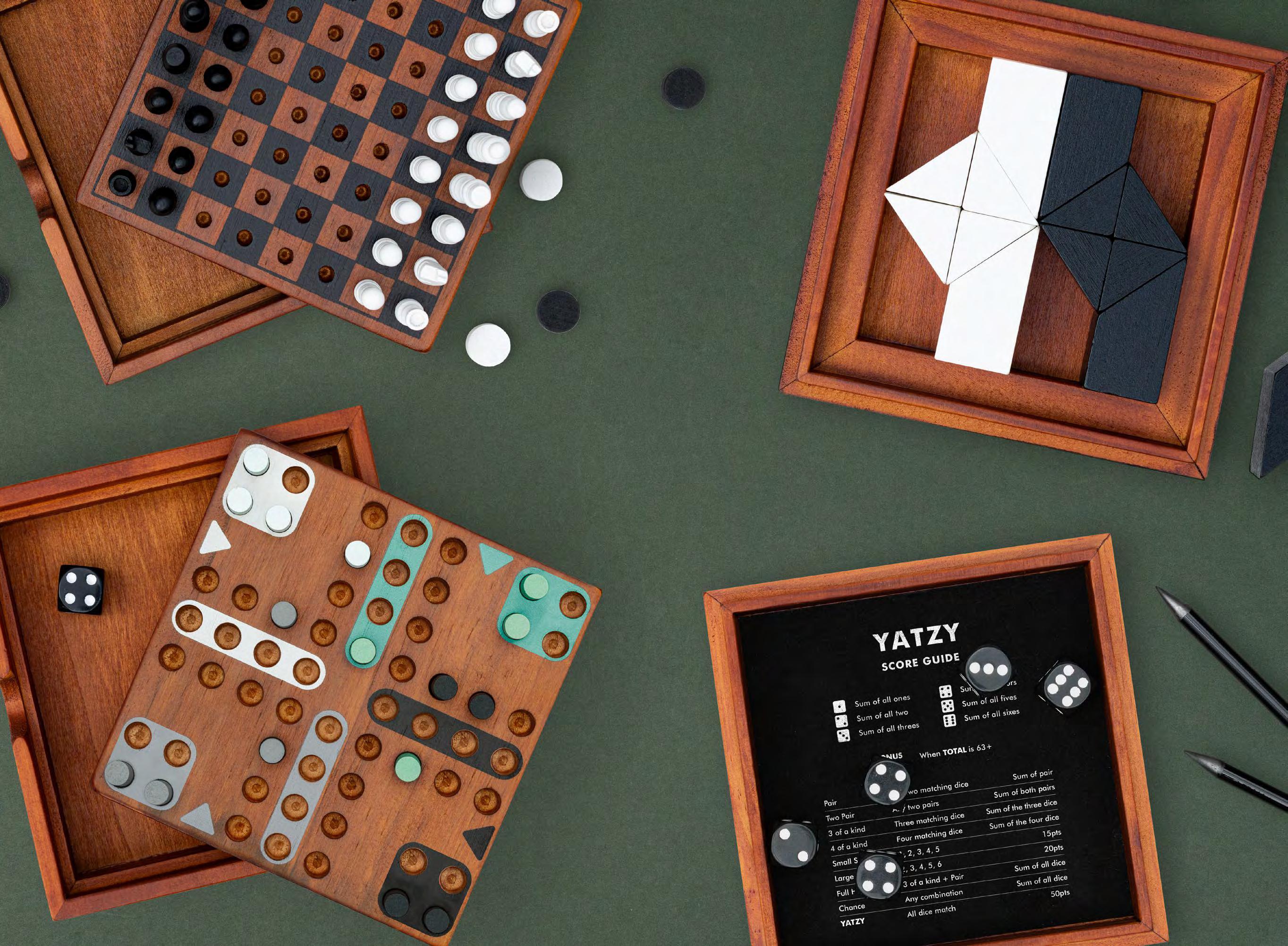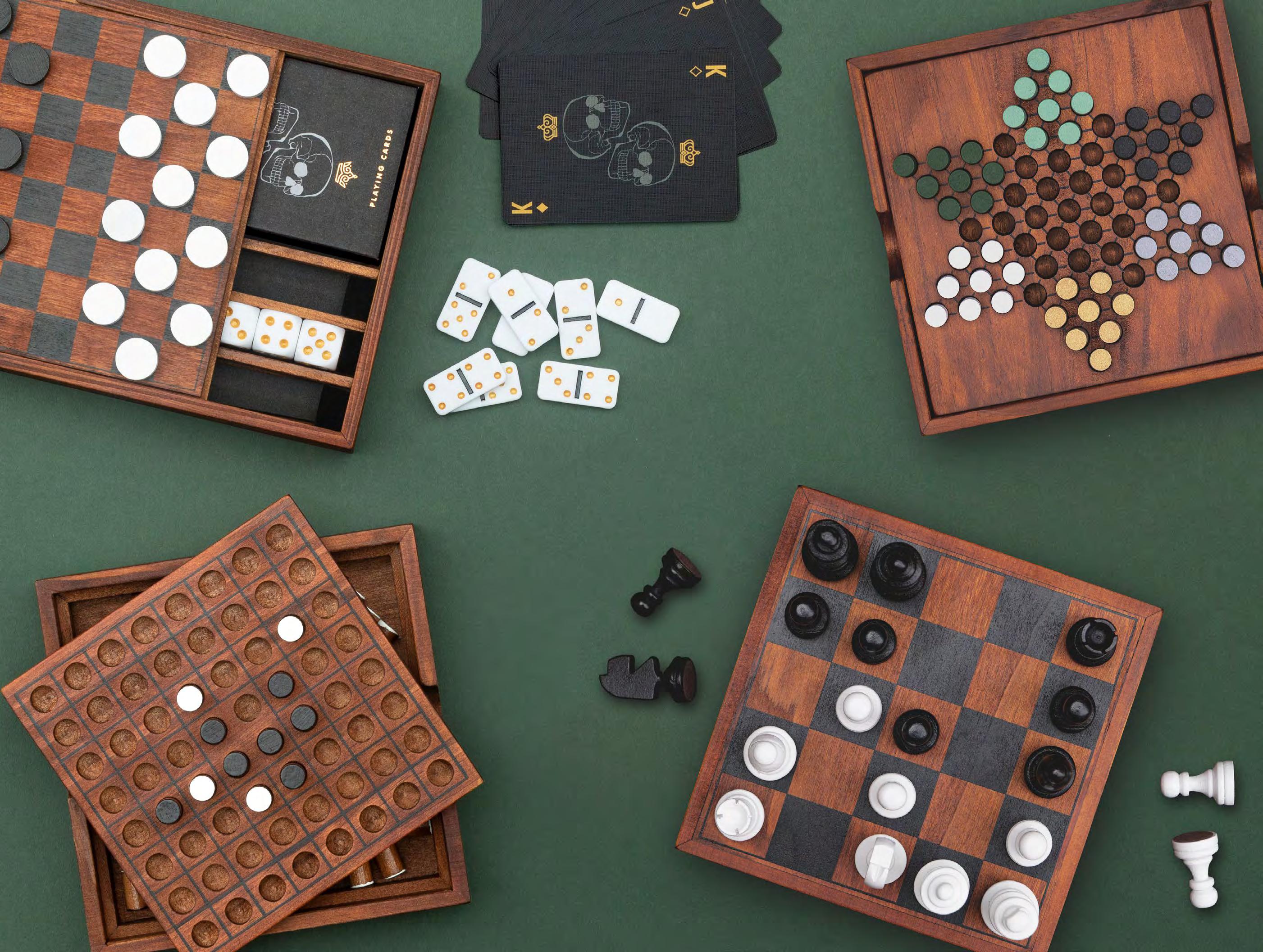 Includes 10 wooden playing pieces. All-in-one design.