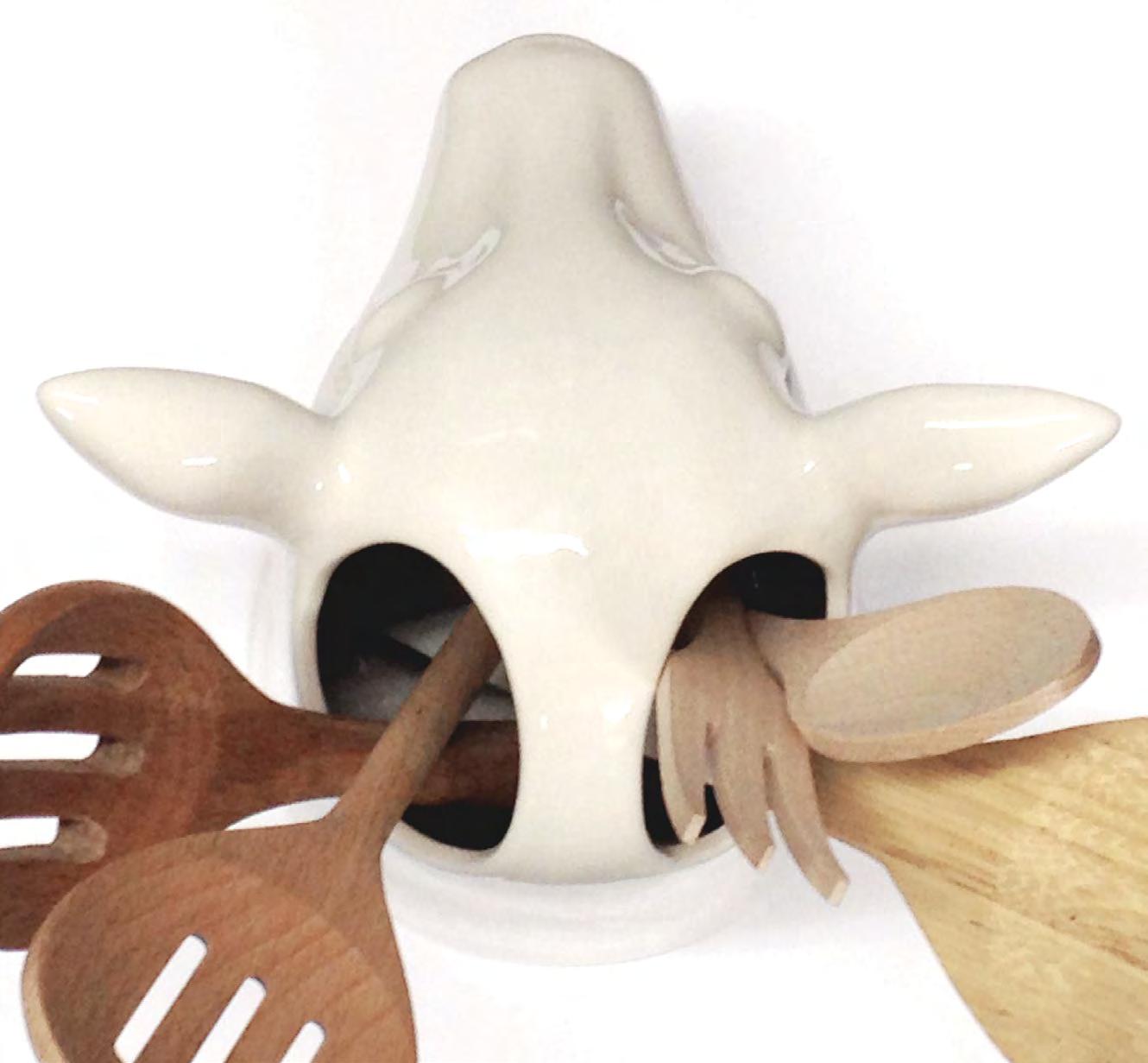 White ceramic deer head. 2 compartments for storing kitchen tools. Also good for flowers.