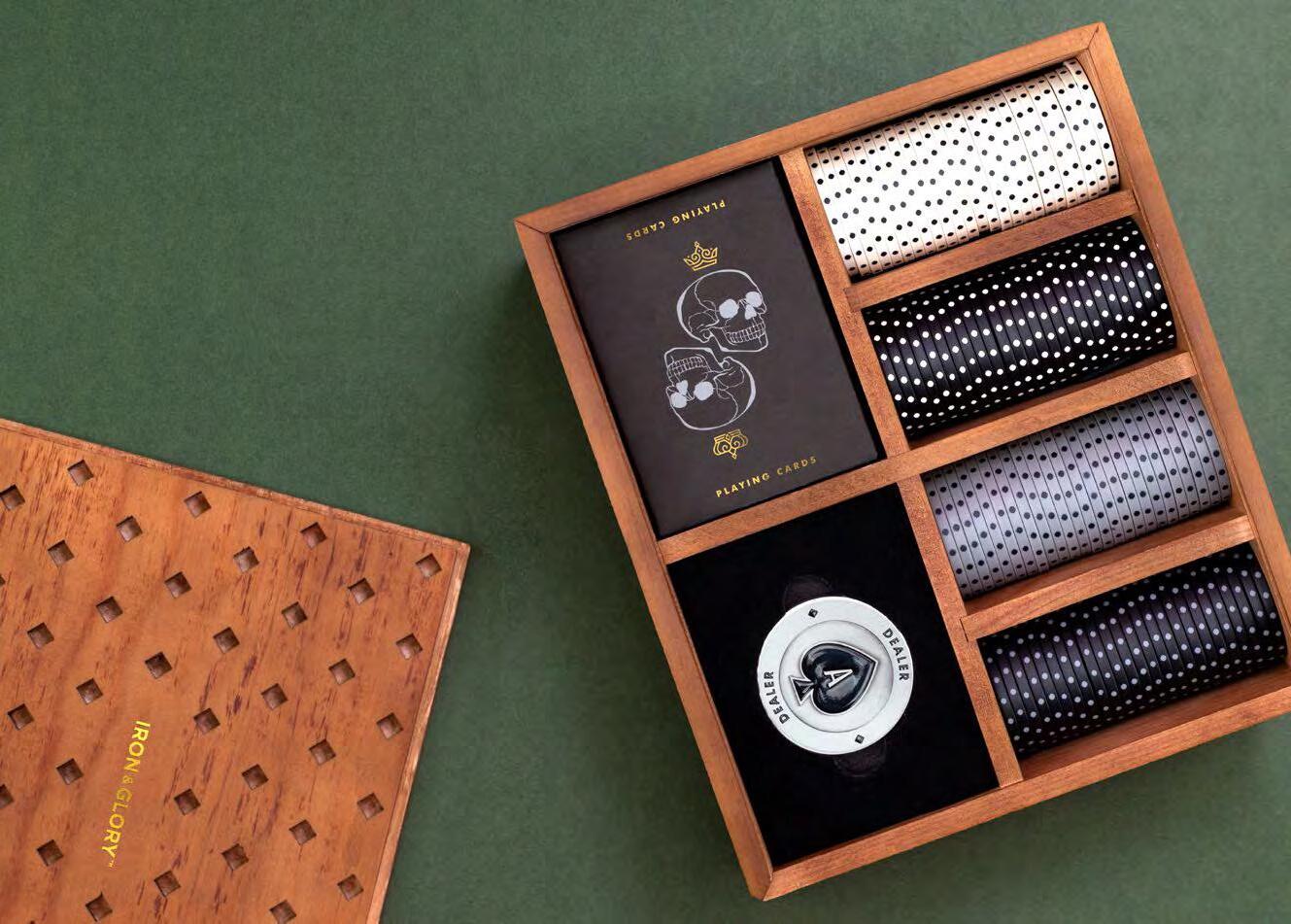 Premium poker set. 100x custom poker chips, an engraved metal dealer chip and black and gold playing cards in a wooden display box.