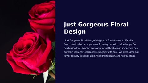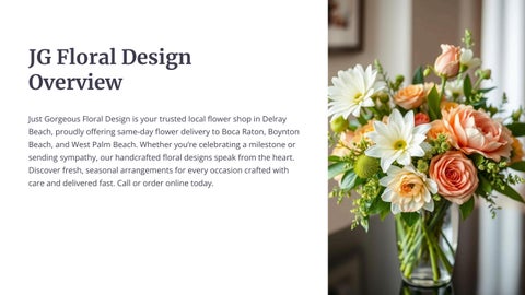 Just Gorgeous Floral Design is the top-rated florist serving Delray Beach, Boca Raton, Boynton Beach, Lake Worth, Greenacres, and West Palm Beach. We specialize in luxury floral arrangements for all occasions. From elegant bouquets to event florals, we create breathtaking designs using fresh, high-quality blooms. Whether it’s for weddings, anniversaries, birthdays, or sympathy flowers, our expert florists craft every arrangement with precision and care.