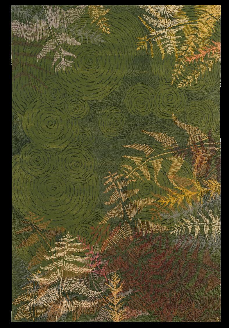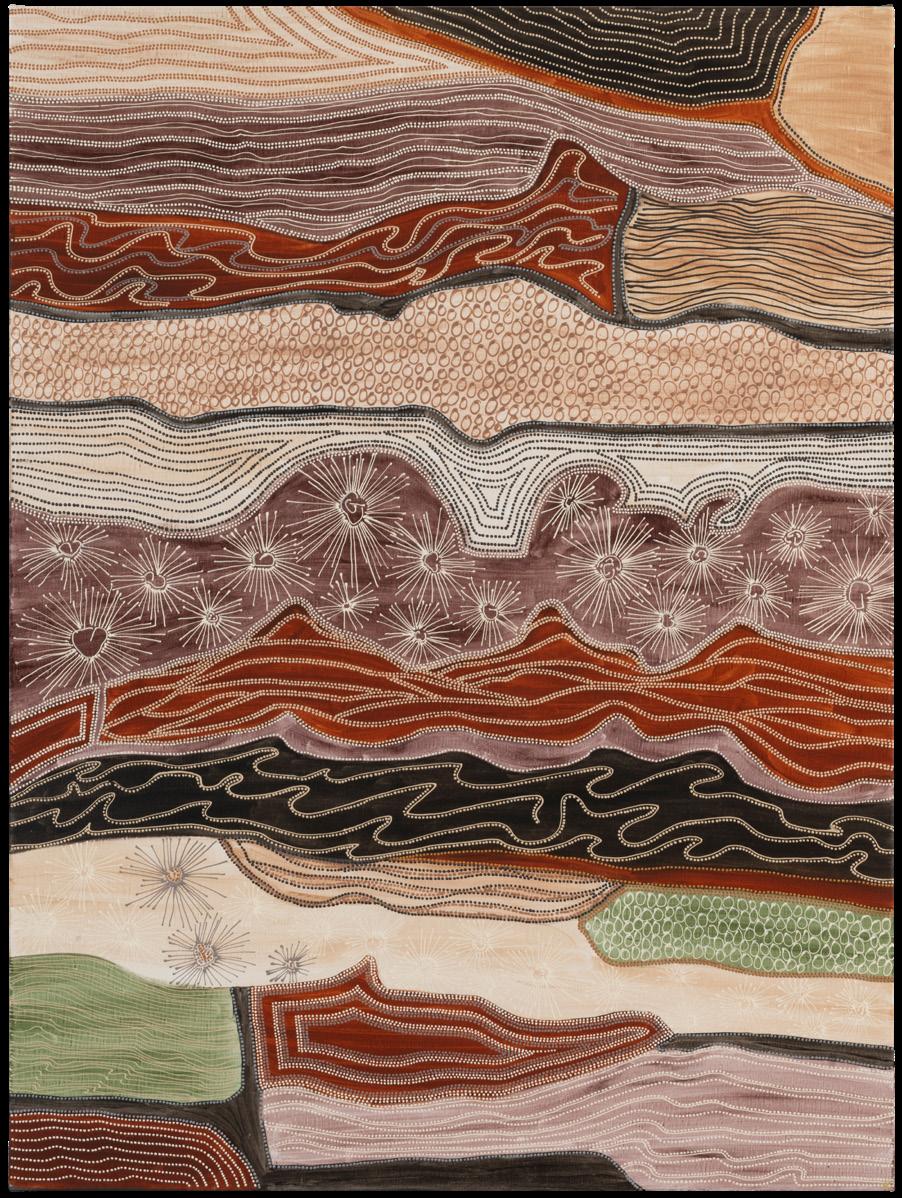 word for either the material, or the item of clothing or accessory which it is used to make. Narang Barraba , for example, is the Gadigal word for a small reed or bulrush from which the Gadigal make necklaces, waistlets and chaplets. Konstantina interprets the young plant as if through its distorted reflection in the water it is commonly found growing beside, or as a dark silhouette set against glaring sunlight. In the upper right of the painting, radials of white dots emanate from a central point, which suggest a ripple or the sun’s halo. These radials are broken by less dense lines of gold dots creating darker recesses, which resemble the elongated forms of reeds. Through this treatment, Konstantina depicts the material in its early stages of growth, within its natural environment, before the mature plant is harvested and dried.