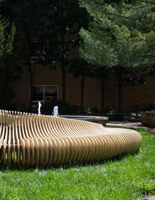 The project is located inside the Murphy Hall courtyard at the University of Kansas. Alongside three other projects the Ostinato Ellipse provides the school of music with outdoor seating encouraging collaboration.