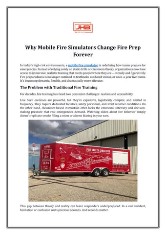 Intoday’shigh-riskenvironments,a mobile fire simulator isredefininghowteamspreparefor emergencies.Insteadofrelyingsolelyonstaticdrillsorclassroomtheory,organizationsnowhave accesstoimmersive,realistictrainingthatmeetspeoplewheretheyare literallyandfiguratively. Firepreparednessisnolongerconfinedtotextbooks,outdatedvideos,oronce-a-yearliveburns. It’sbecomingdynamic,flexible,anddramaticallymoreeffective.