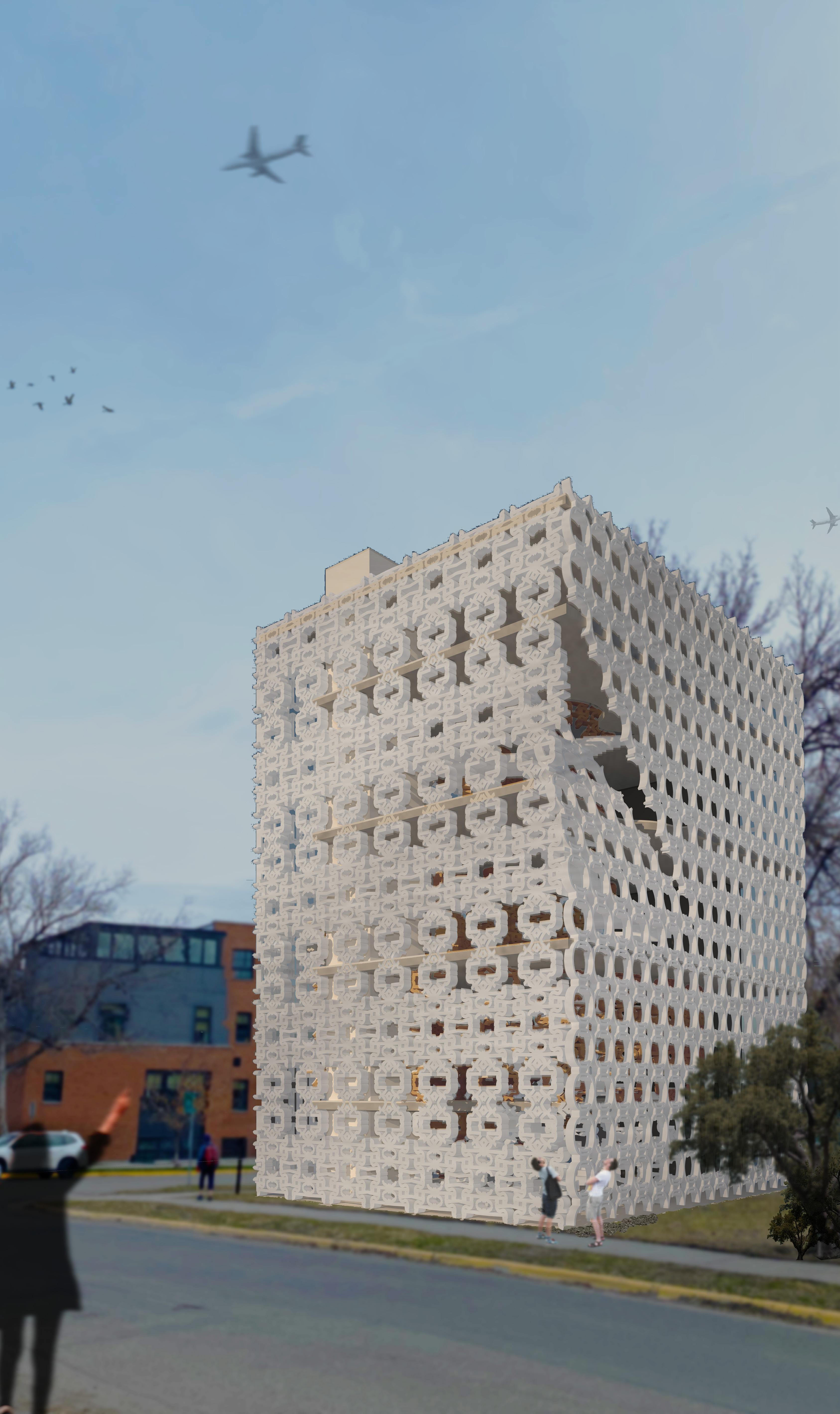 Photoshop and V-Ray through Rhino were used to assign material to the Studio Design project. The exterior is ivy stone and the interior features concrete and wood. The interiors intent is to feel airy and modern while the exterior is a heavy brutalist aesthetic.