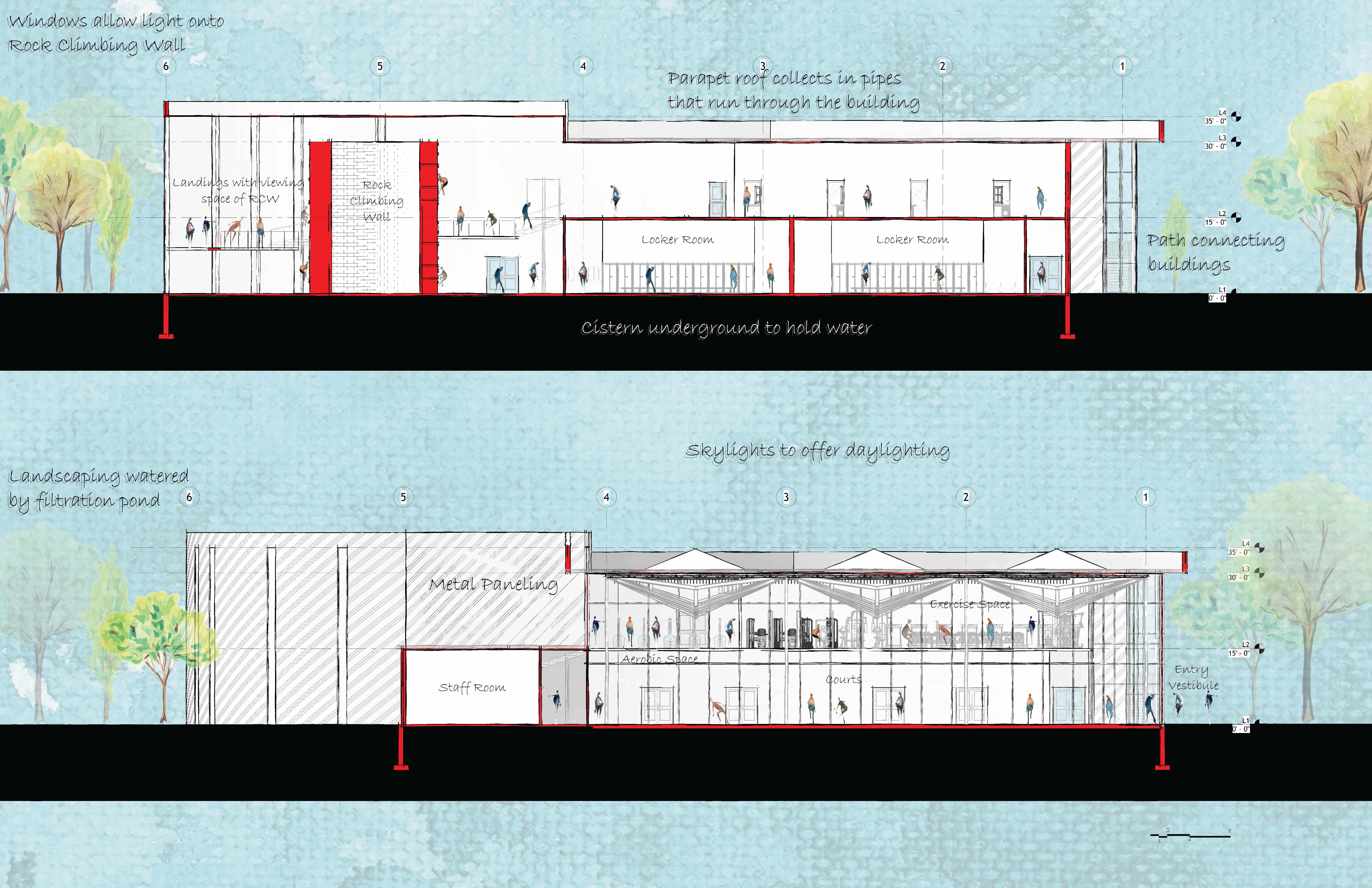 My partners and I were tasked with creating a complex of buildings for the Bozeman Public Library adjacent to the Gallatin High School located in Bozeman, Montana. The buildings consisted of a gym/recreation center, a library and a swim center. The three buildings were meant to collaborate with each other and be as sustainable as possible. I was tasked with the gymnasium, which sat directly south of the swim center. We were able to sustainably share water between the two buildings and filter rainwater, grey water and pool water through a filtration pond located between the two buildings. This project was driven by COTE design parameters.