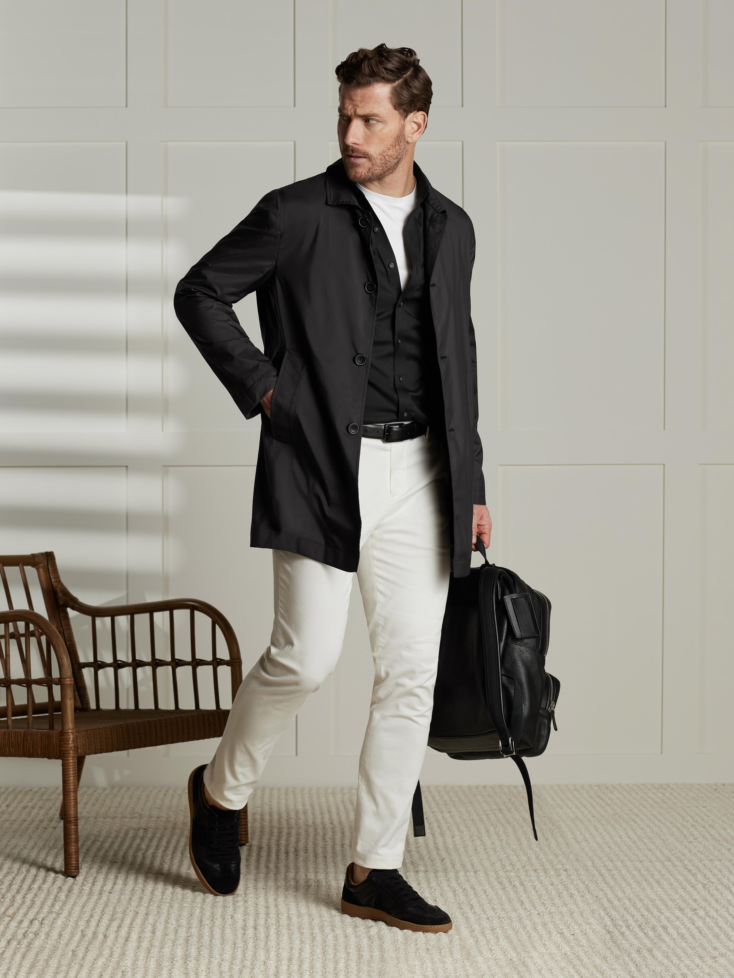 Our Eco Tech fabric is engineered through a sustainable process that transforms post-consumer garments and textiles into regenerated polyester, delivering the performance and feel of virgin fiber with significantly reduced environmental impact. Water and wind resistance helps maintain a sleek, tailored look.