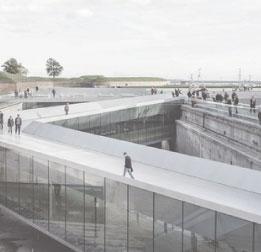 THE DANISH NATIONAL MARITIME MUSEUM IS BUILT ADJACENT TO THE HISTORIC KRONBORG CASTLE. THE DESIGNERS’ INTENT FOR THE SITE WAS TO PRESERVE VIEWS TO THE CASTLE, WHILE ALSO GUIDING THE PEDESTRIAN EYE DOWN TO THE CONCRETE SILHOUETTE OF THE 60 YEAR OLD DRY DOCK. EXHIBITION SPACES ARE HOUSED 23 FEET BELOW THIS EXCAVATED SPACE, CONNECTED BY THREE DOUBLE-TIERED BRIDGES WHICH LINK GALLERY SPACES. THE ZIG-ZAGGING FOOTPRINT MARKS ENTRY AS ONE PIECE OF THE BRIDGE SLIPS UNDER GRADE, WHILE ALSO PROVIDING VISITORS WITH SHORTCUTS TO DIFFERENT SECTIONS OF THE EXHIBITS. THE WALLS OF THE DOCK WERE LEFT UNTOUCHED DURING THE DESIGN PROCESS, AND THE GALLERY SPACES LOOP AROUND THE WALLS TO ALLOW FOR THE VISITORS TO EXPERIENCE THE GREAT SCALE OF THE SHIPS THAT ONCE OCCUPIED THE DOCK. WALL SECTION // 3” = 1’-0”