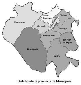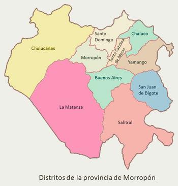 TIENE10DISTRITOS,ENELCASO DE CHULUCANAS, SANTO DOMINGO, MORROPÓN Y LA MATANZA, SON LOS DISTRITOS PRÓXIMOS,SIENDOSALITRAL,SAN JUAN DE BIGOTE LOS MÁS LEJANOS.
