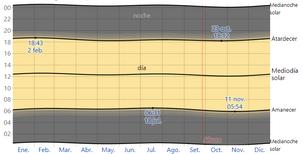 Eldíamáscortoesel21dejunio,con11 horas y 50 minutos de luz natural; el día más largo es el 21 de diciembre, con 12 horasy25minutosdeluznatural.