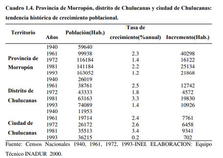 ELDISTRITODECHULUCANAS,ESELQUEMÁSPOBLACIÓNABARCAENLAPROVINCIADE MORROPÓNASÍ,ENLOSCENSOSDE1981,1993Y2007LAPOBLACIÓNDELDISTRITO REPRESENTÓEL44.7%,45.4%Y47.70%,RESPECTIVAMENTEDELAPOBLACIÓNTOTAL DEMORROPÓN.REGISTRÓUNAPOBLACIÓNDE63,163HAB.EN1981,DE74,089HAB.EN 1993Y76205HAB.EN2007;LOQUESIGNIFICAQUEENELLAPSODE26AÑOS,LA POBLACIÓN DEL DISTRITO SE INCREMENTÓ EN 13,042 HAB Y ACTUALMENTE LA POBLACIÓNAUMENTÓENUNLAPSODE36AÑOS19398.