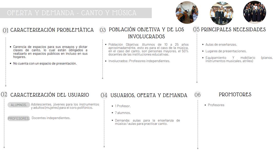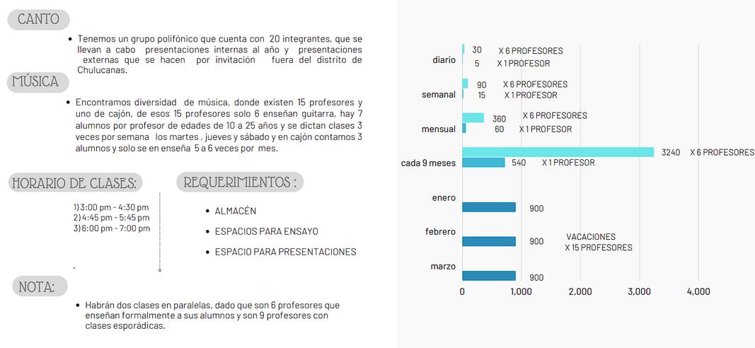 Hay un profesor por cada 7 a 8 alumnos, en total hay 15 profesores, podemos concluir que necesitamos mínimo dos ambientes para satisfacer la necesidad de dar aulas a los músicos y cantantes de Chulucanas.