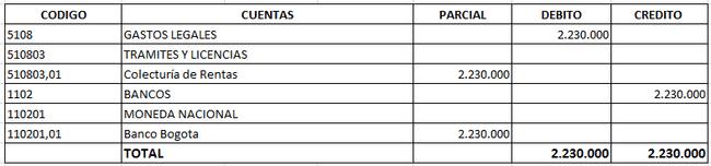 5. El 6 de noviembre se efectúa el pago en colecturía de rentas la boleta fiscal por valor de $ 2.230.000, girando cheque No. 0001 Del Banco Bogotá y CE _001______